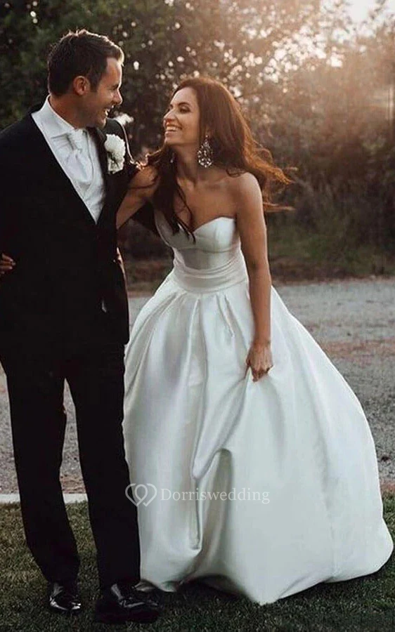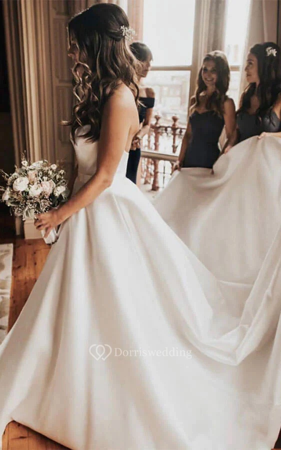 Simple Sweetheart A-line Ball Gown Backless Solid Wedding Dress with Chapel Train