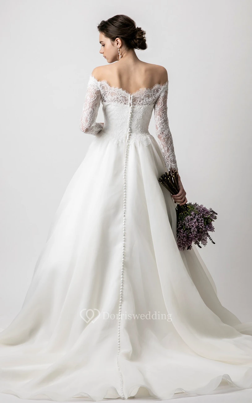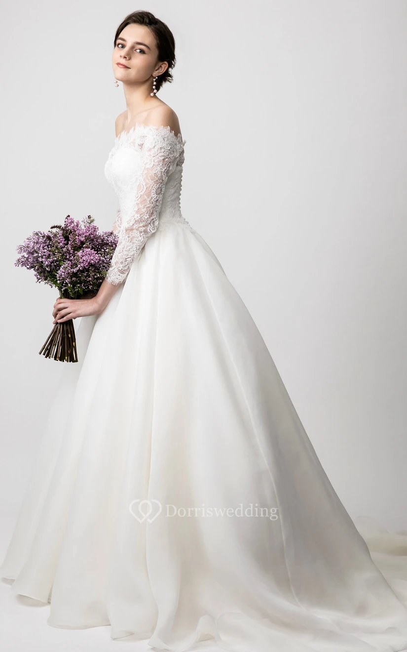 Simple Organza Ball Gown Floor-length Long Sleeve Wedding Dress with Ruching