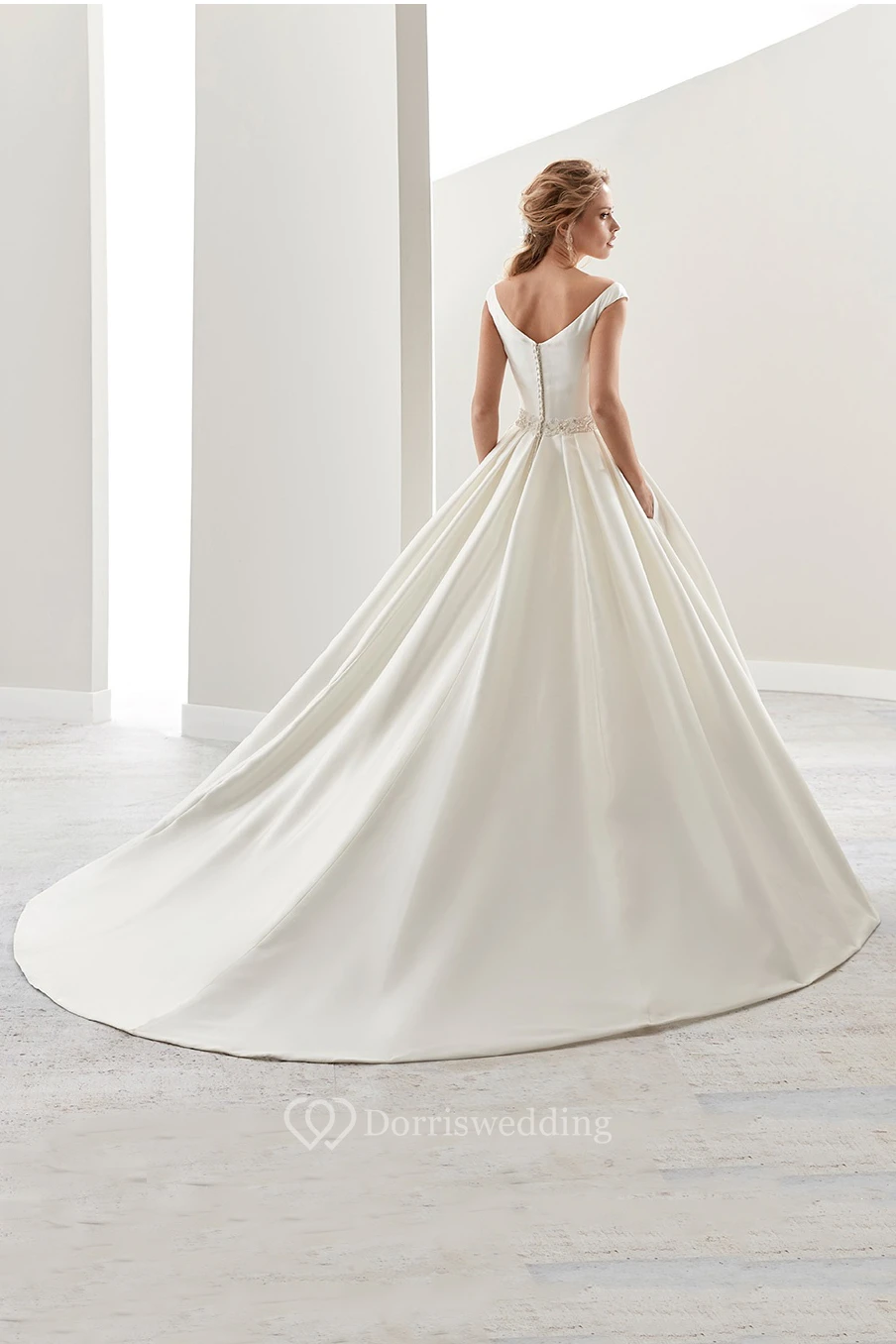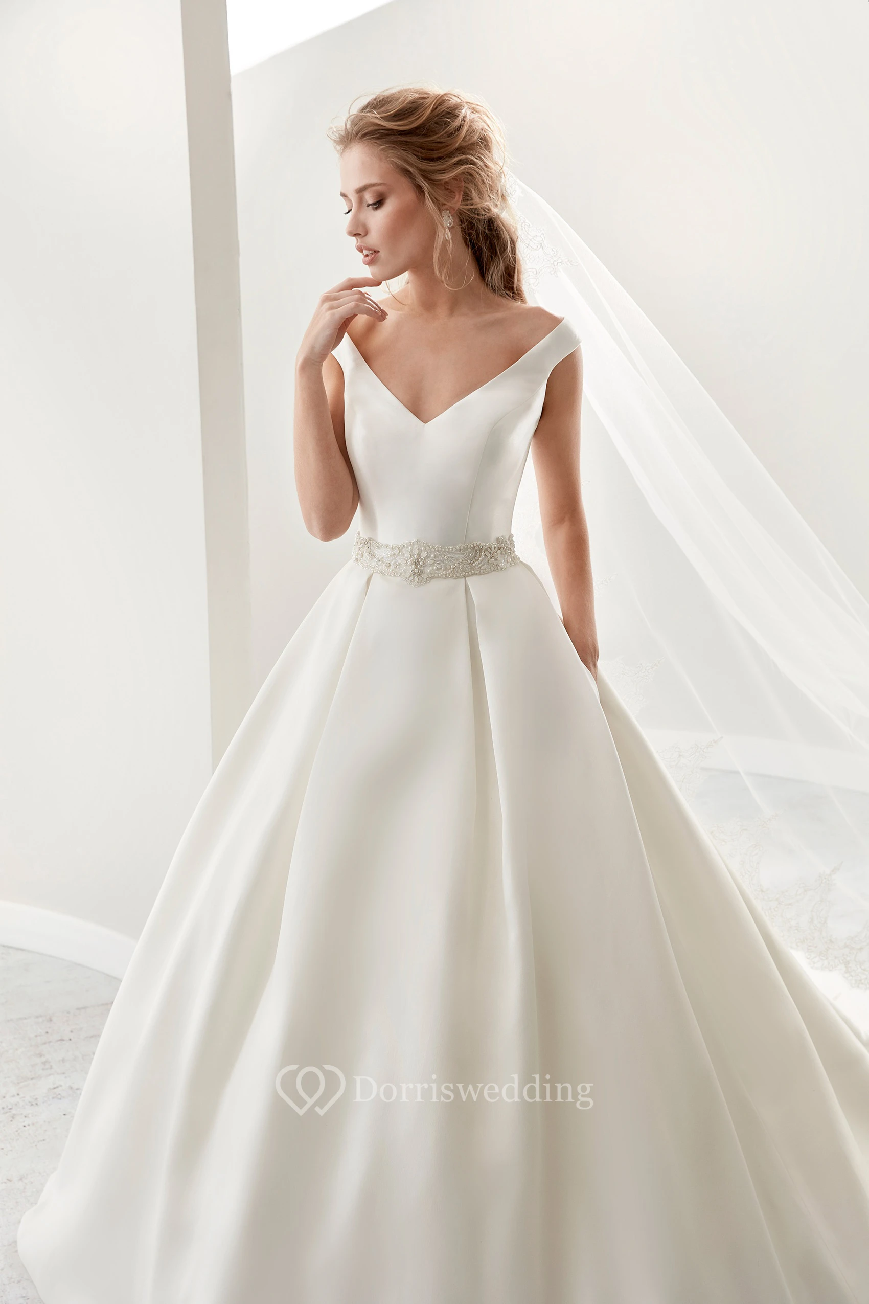 Simple V-Neck A-Line Satin Wedding Dress Styles With Beaded Belt And Brush Train
