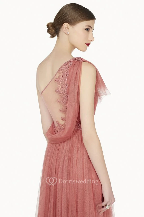 Single Ruffled Strap A-Line Tulle Long Prom Dress Illusion Back With Cowl