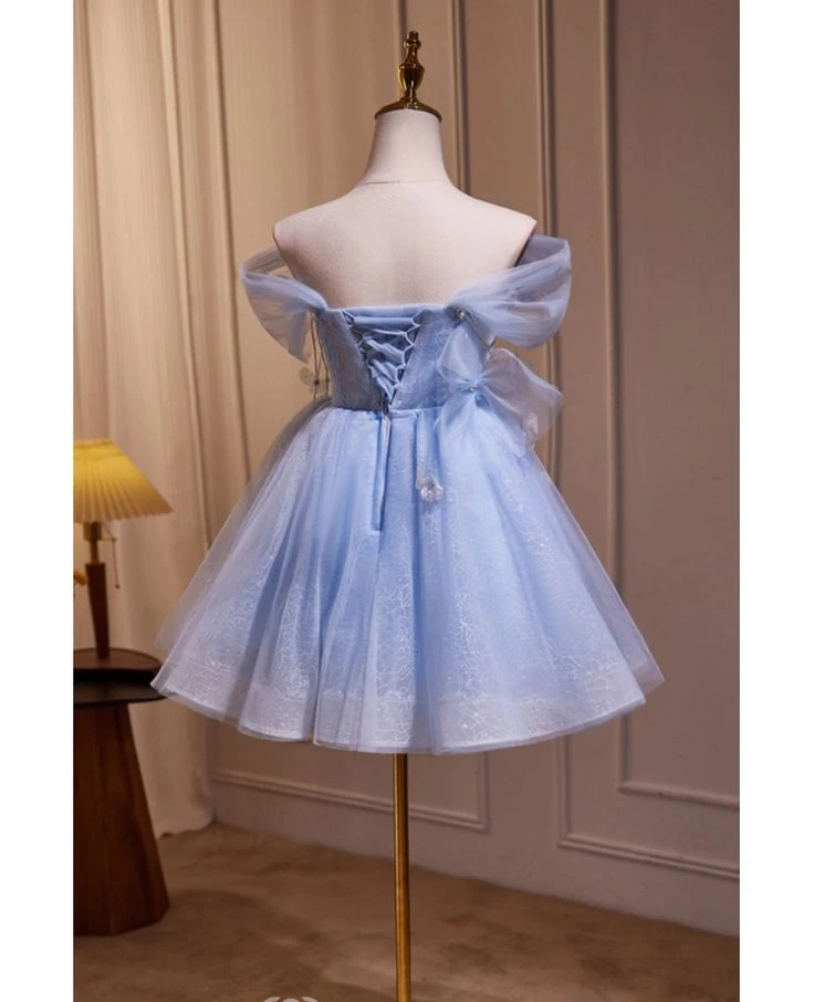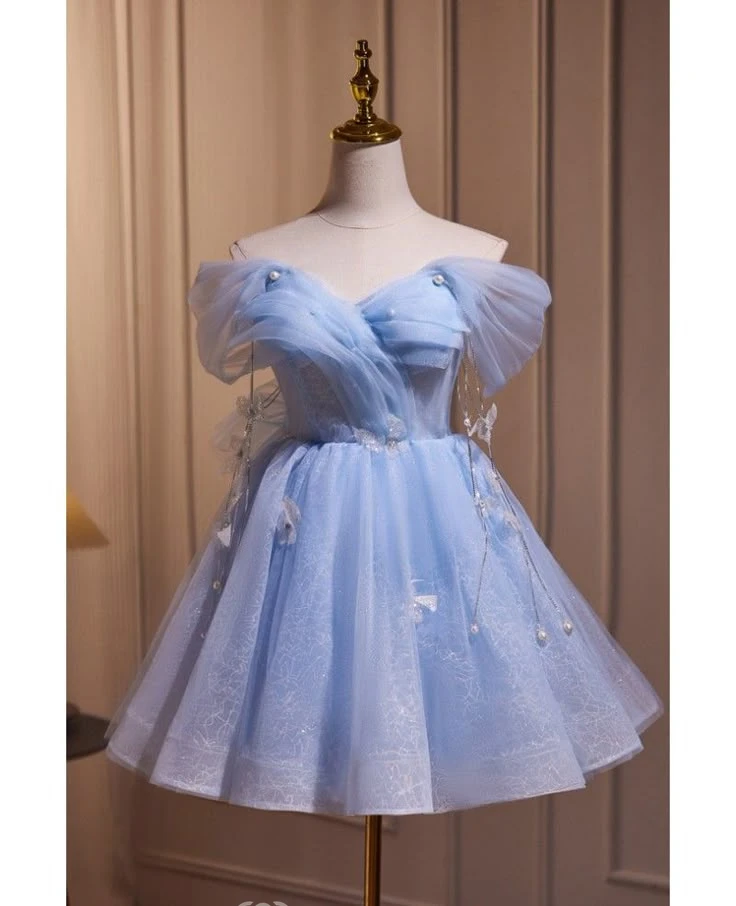 This charming sky blue dress features an off-the-shoulder design with wide, ruffled tulle sleeves adorned with pearl embellishments. The bodice is structured and smooth, while the multi-layer tulle skirt has an intricate lace pattern and ends above the knees. Perfect for parties or formal events, it offers a romantic and ethereal look. The delicate details and lightweight fabric ensure comfort and style for various occasions.