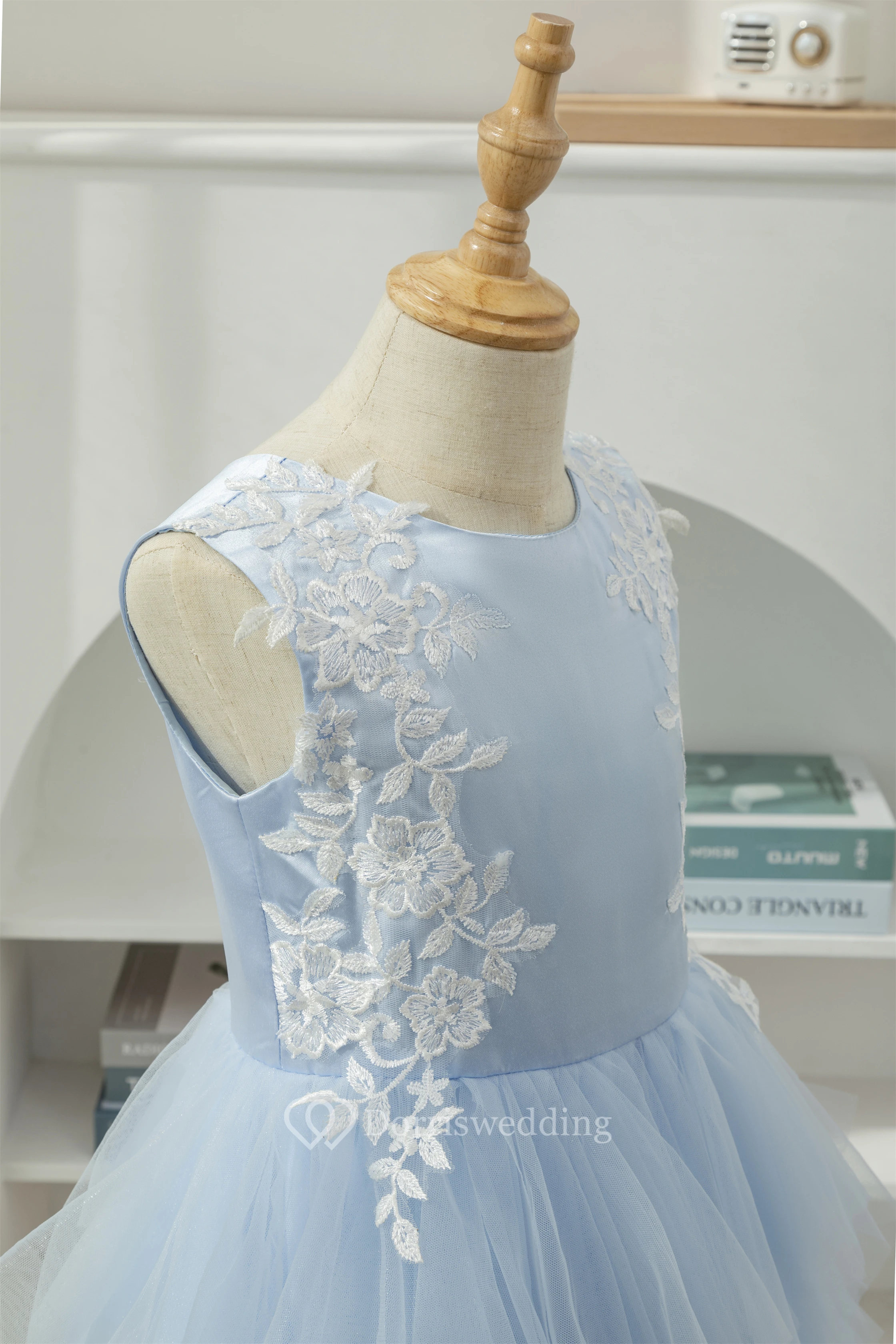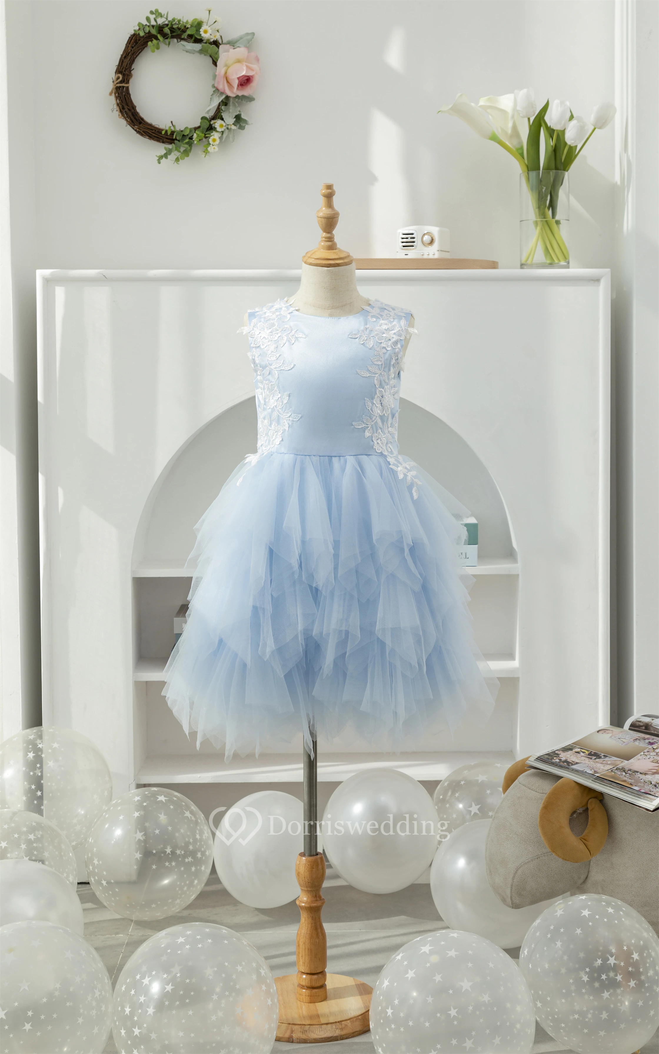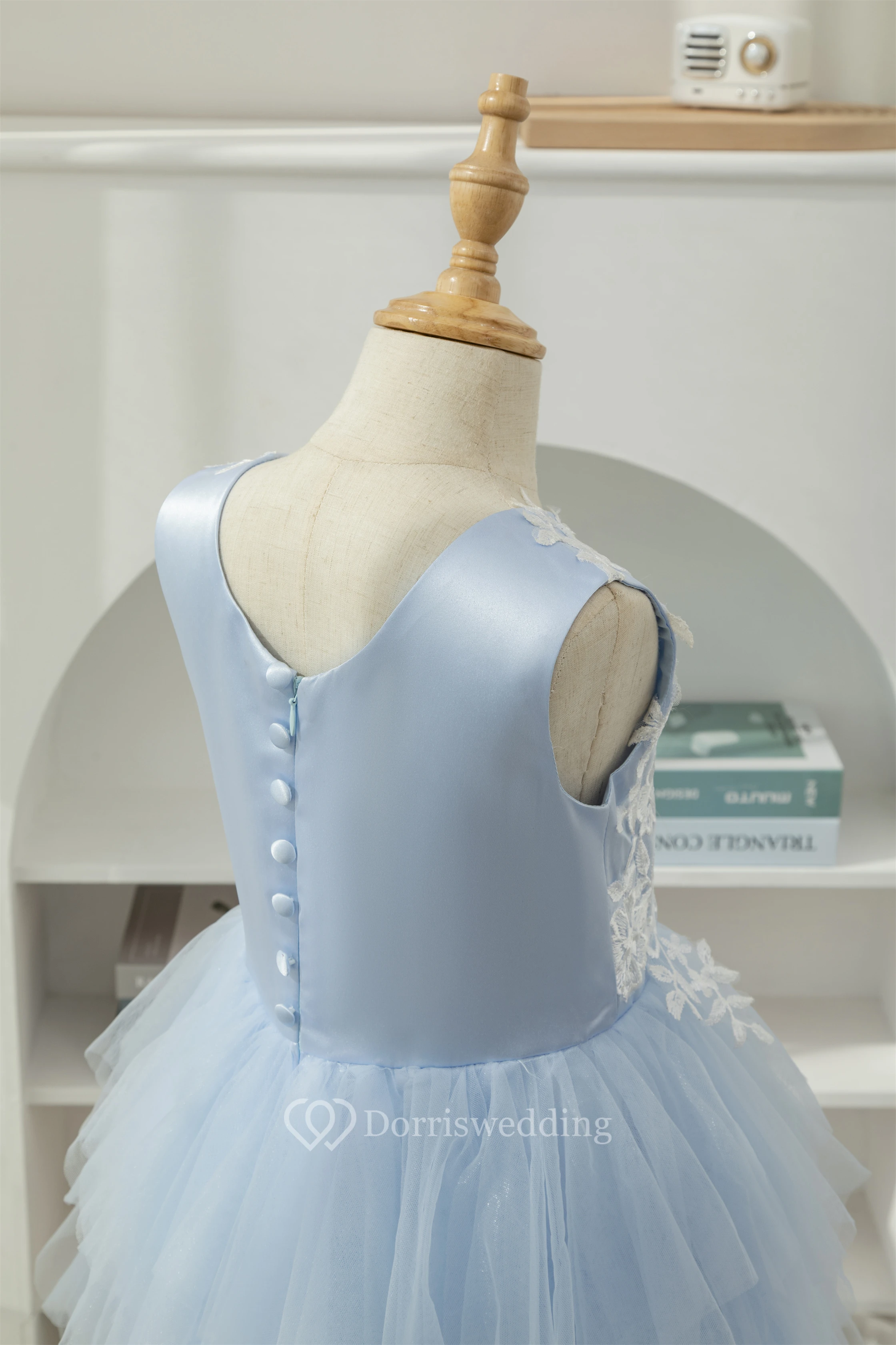 Sky Blue Scoop-neck Applique Ruffled Tulle Short Flowergirl Dress