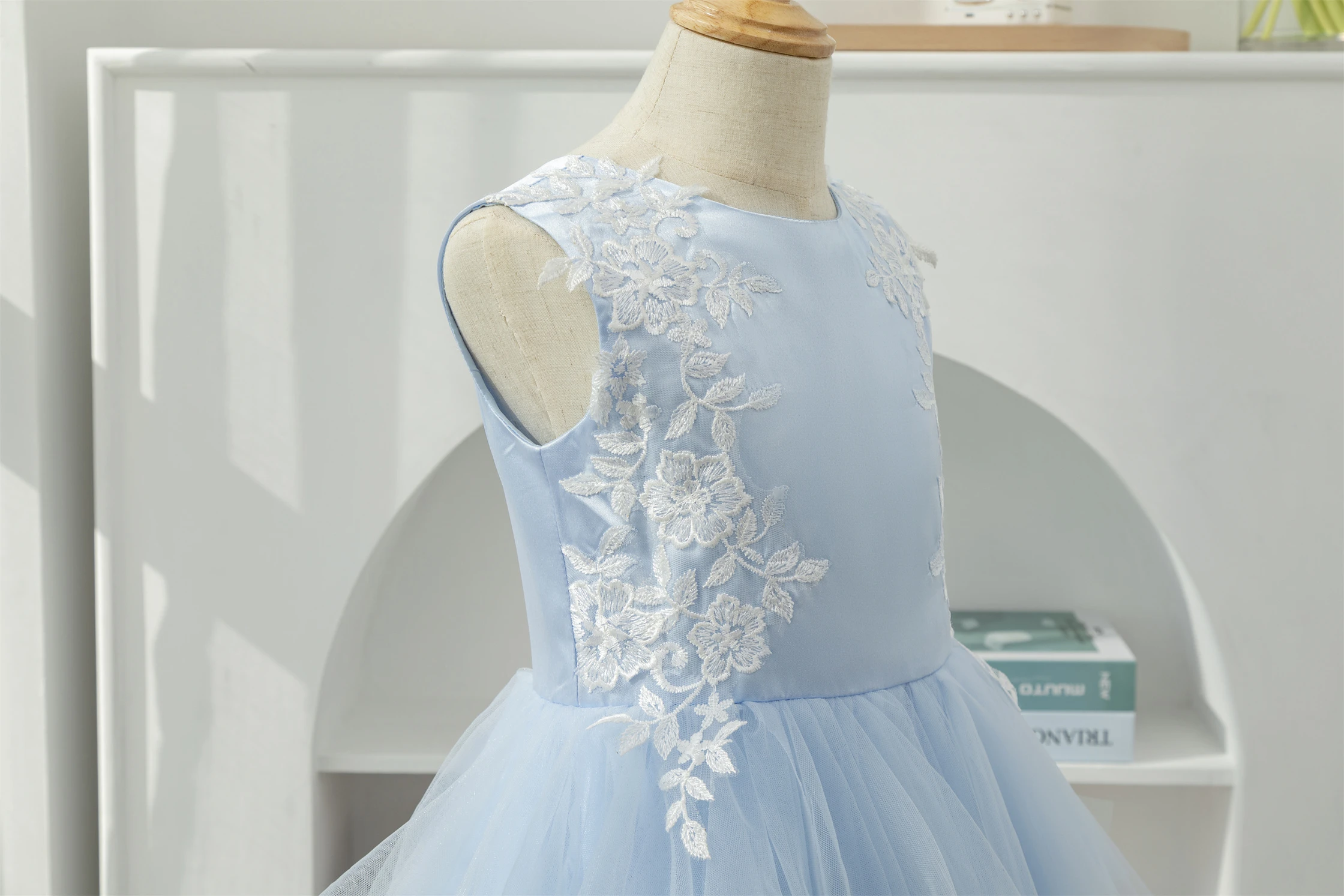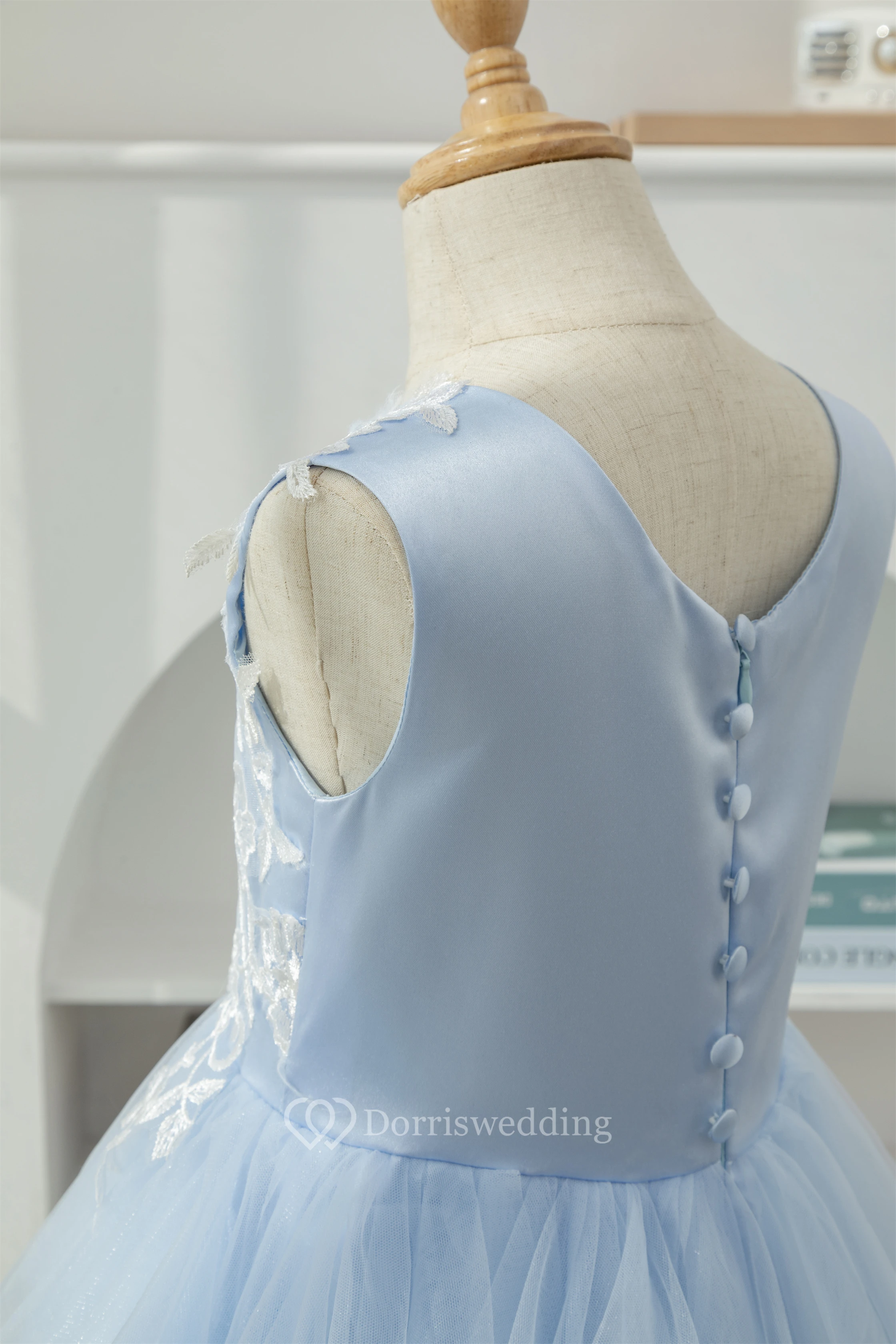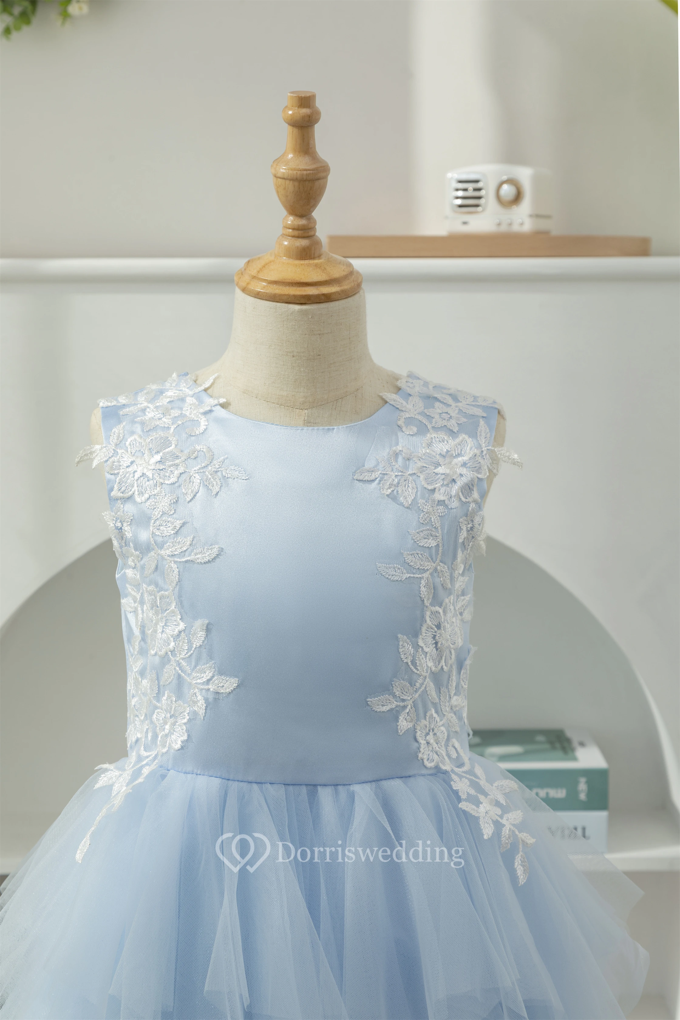 Sky Blue Scoop-neck Applique Ruffled Tulle Short Flowergirl Dress