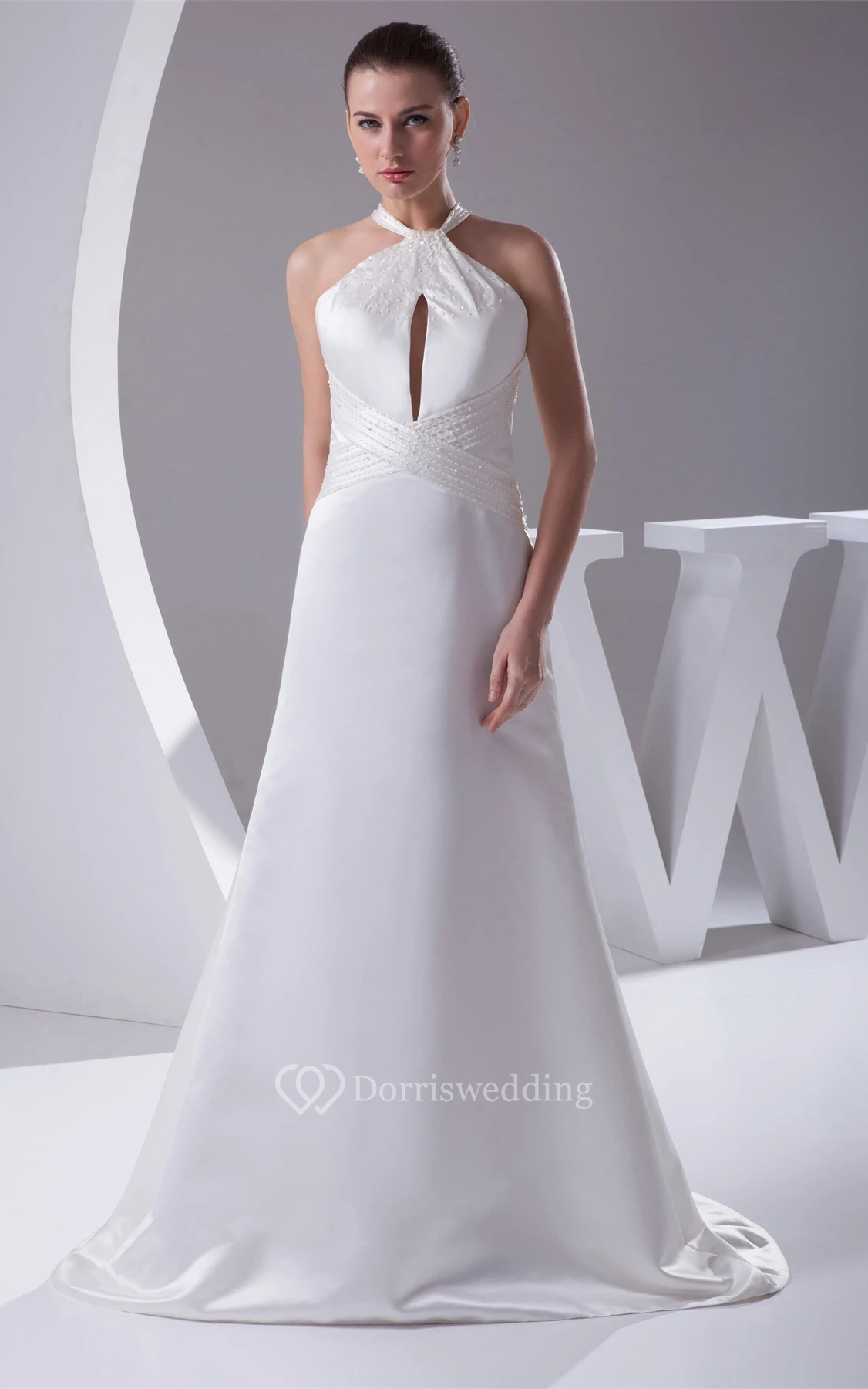 Sleeveless A-Line Jeweled Satin Keyhole and Dress With Halter