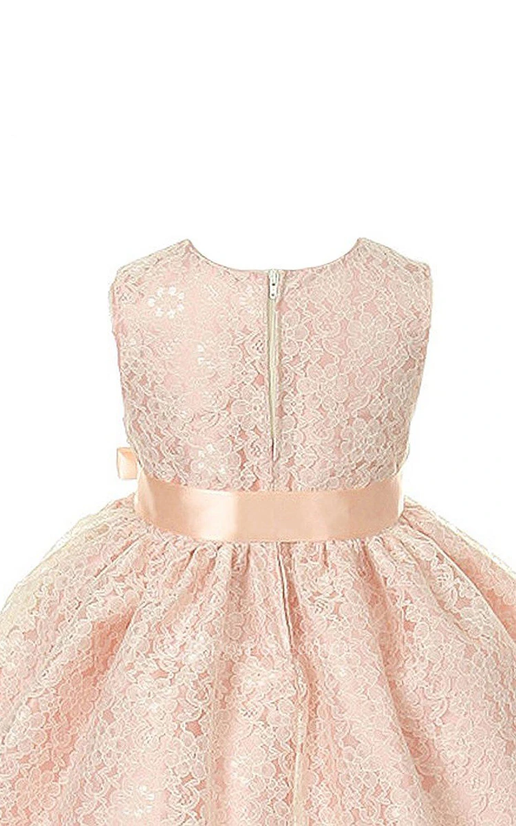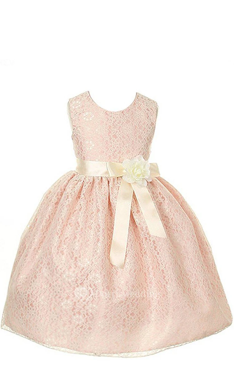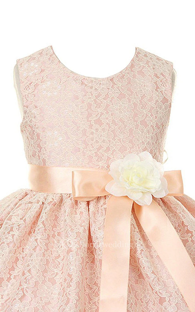 Sleeveless A-line Lace Dress With Floral Sash