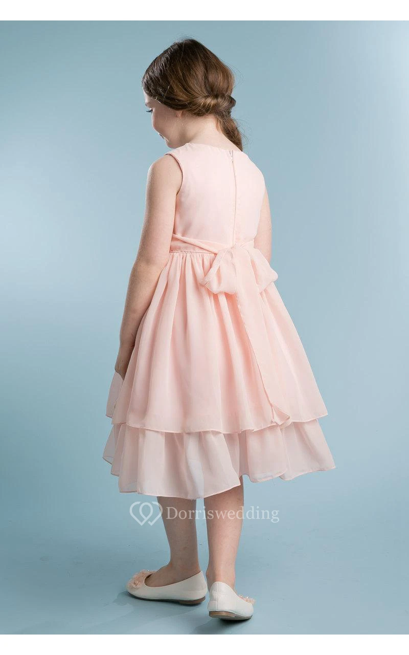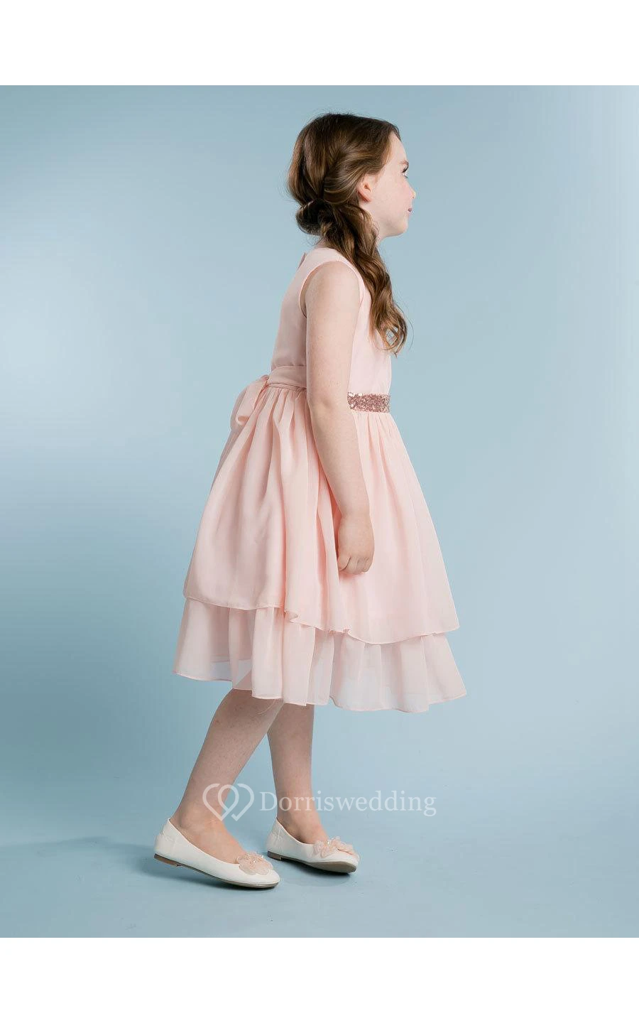 Sleeveless A-line Layered Chiffon Short Dress With Sequined Sash and Pleats