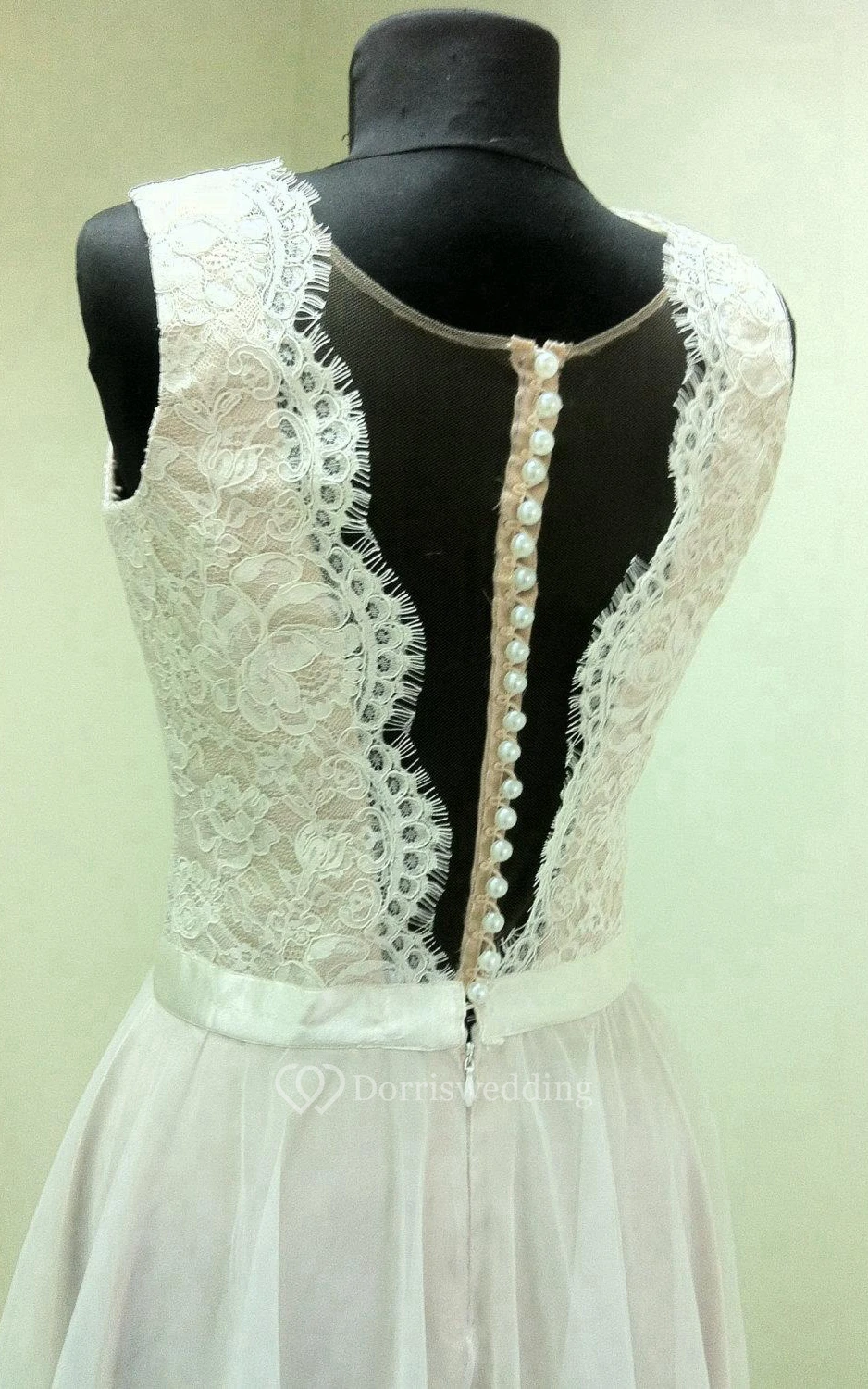 Sleeveless A-Line Pleated Tulle Dress With Lace Bodice and Scalloped V-Neck