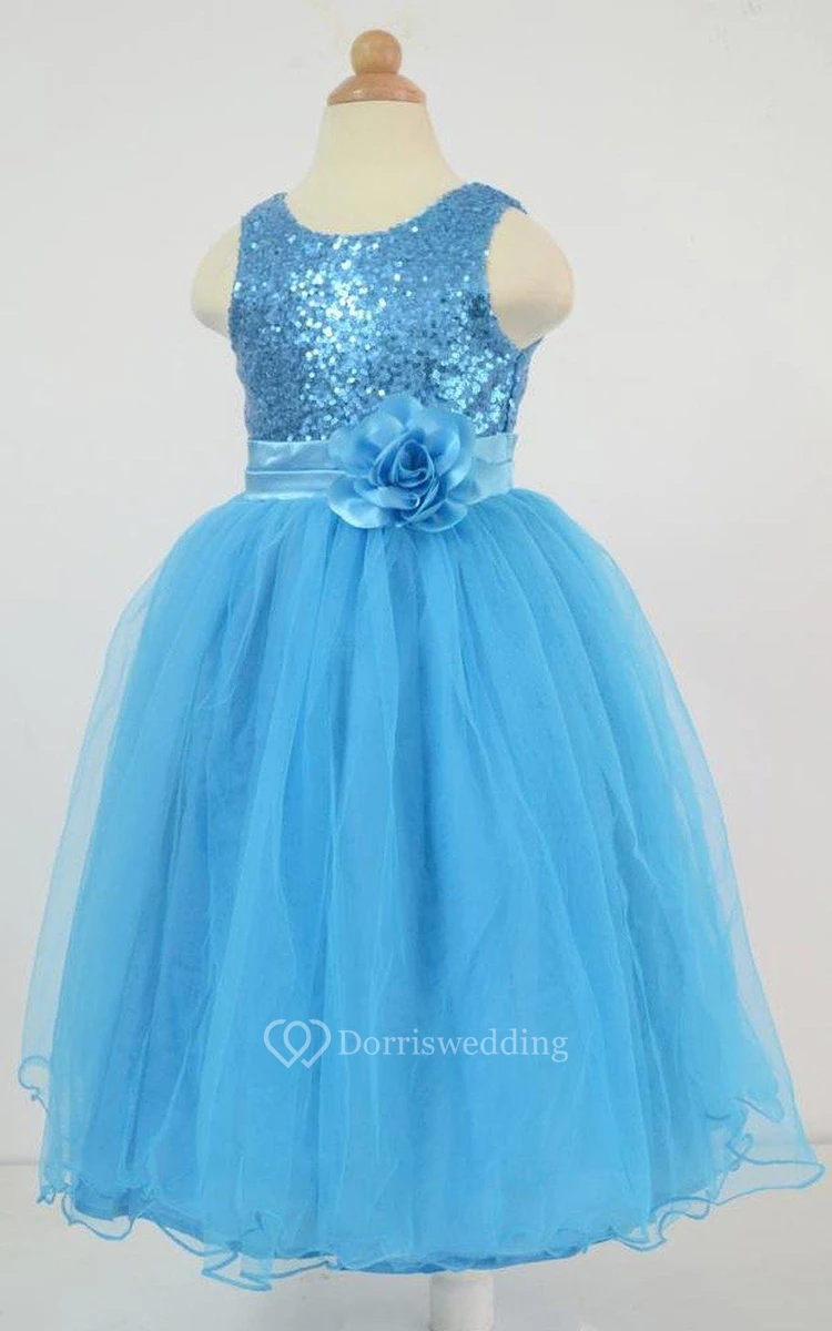 Sleeveless A-line Sequined Dress With Flower and Pleats