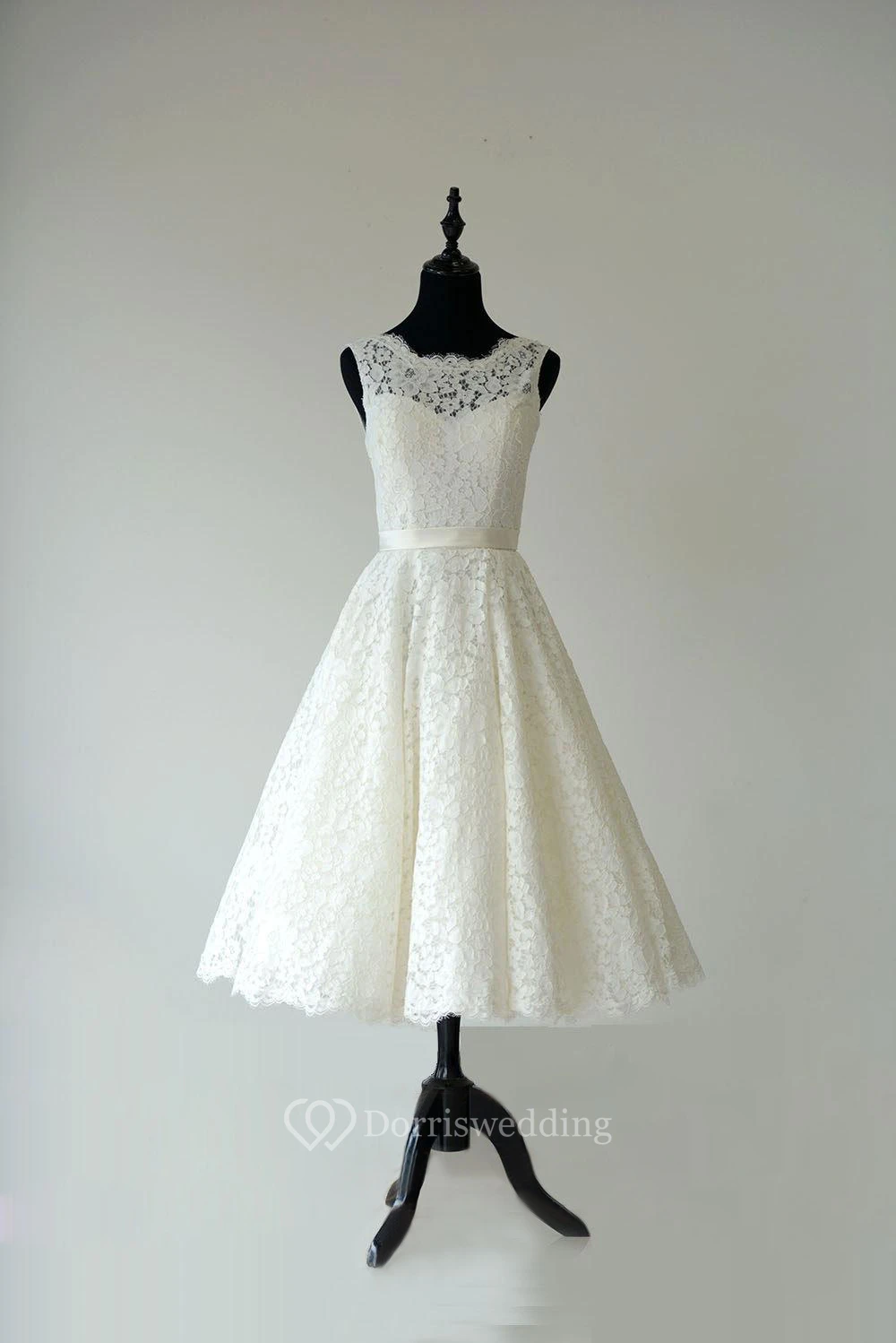 Sleeveless A-Line Tea Length Lace Dress With Low-V Back and Satin Sash