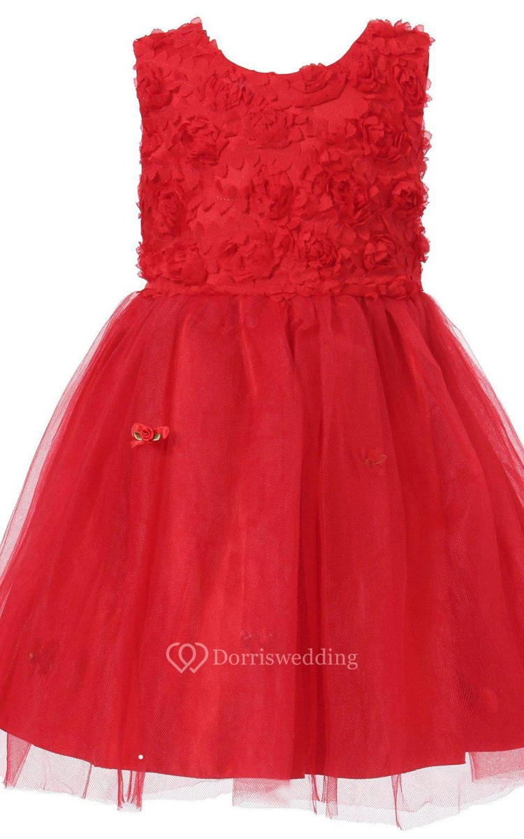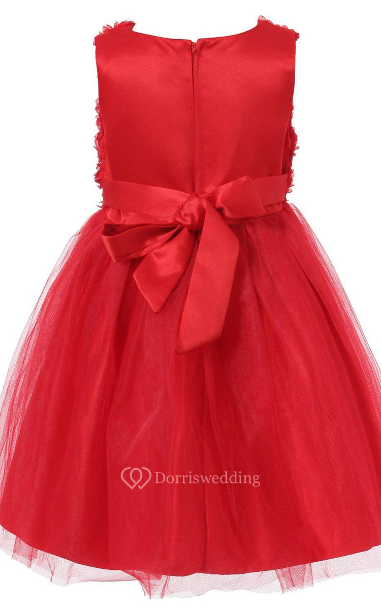 Sleeveless A-line Tulle Dress With Petals and Bow