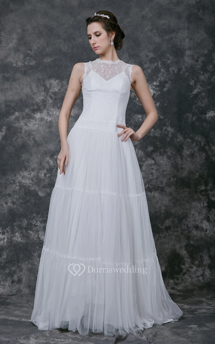 Sleeveless A-line Tulle Gown With Sheer High Neck