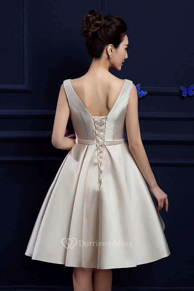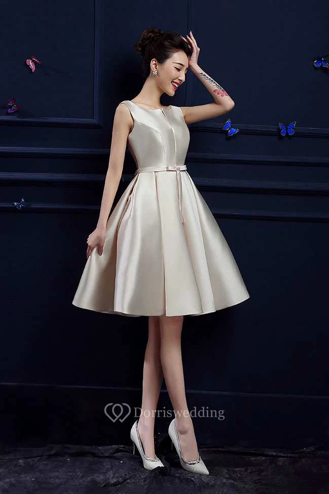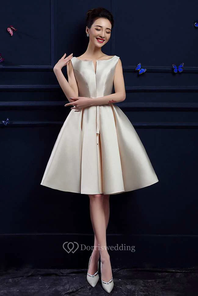 Sleeveless Bateau Neck Pleated Knee Length Satin Dress