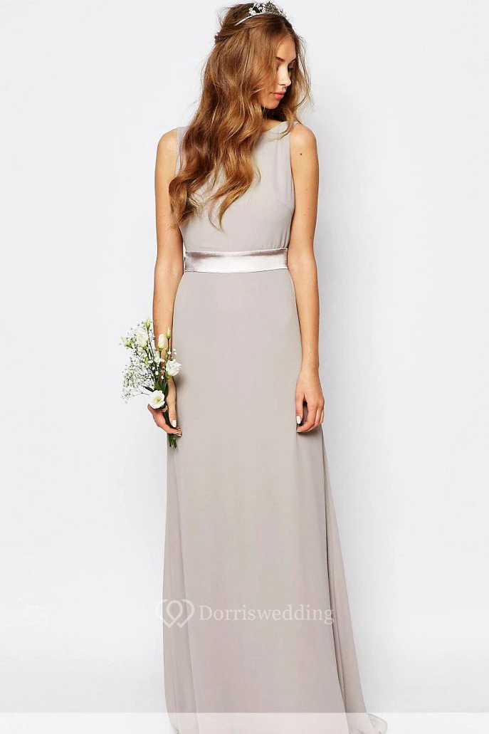 Sleeveless Bateau Neck Ribboned Chiffon Bridesmaid Dress With Brush Train