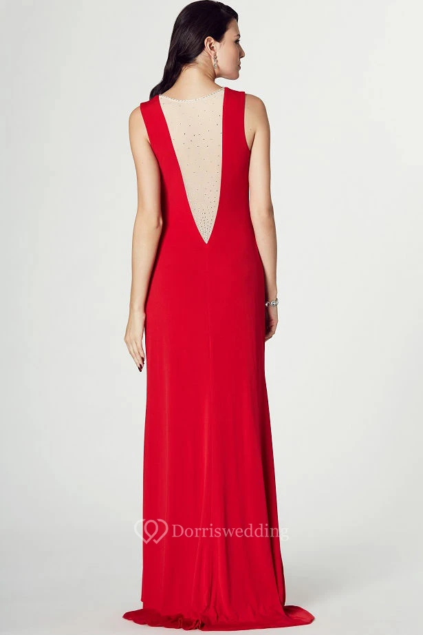 Sleeveless Beaded Jewel Neck Jersey Prom Dress With Brush Train
