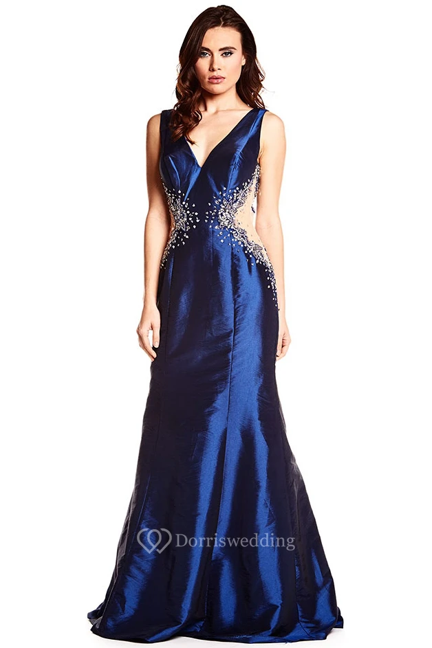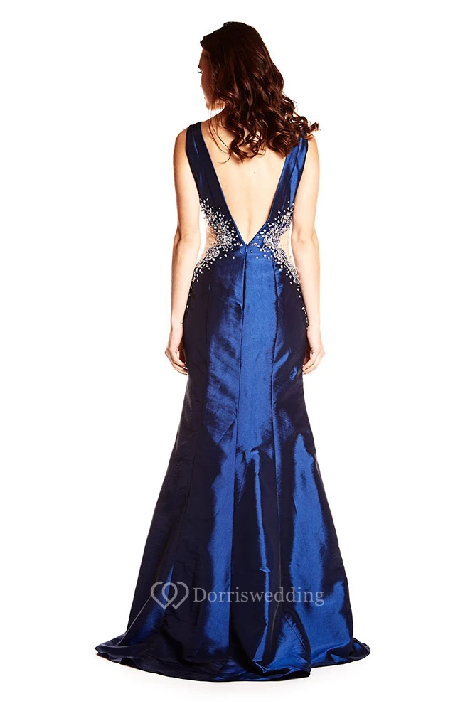 Sleeveless Beaded Maxi V-Neck Satin Prom Dress With Deep-V Back