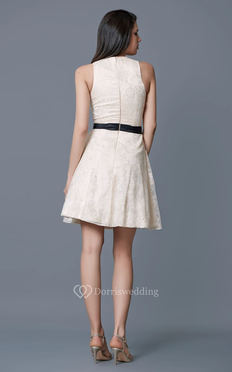 Sleeveless Beaded Neckline Short Lace Dress With Satin Belt