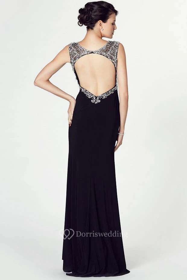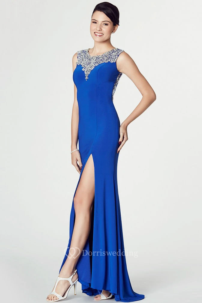 Sleeveless Beaded V-Neck Jersey Prom Dress With Split Front And Keyhole