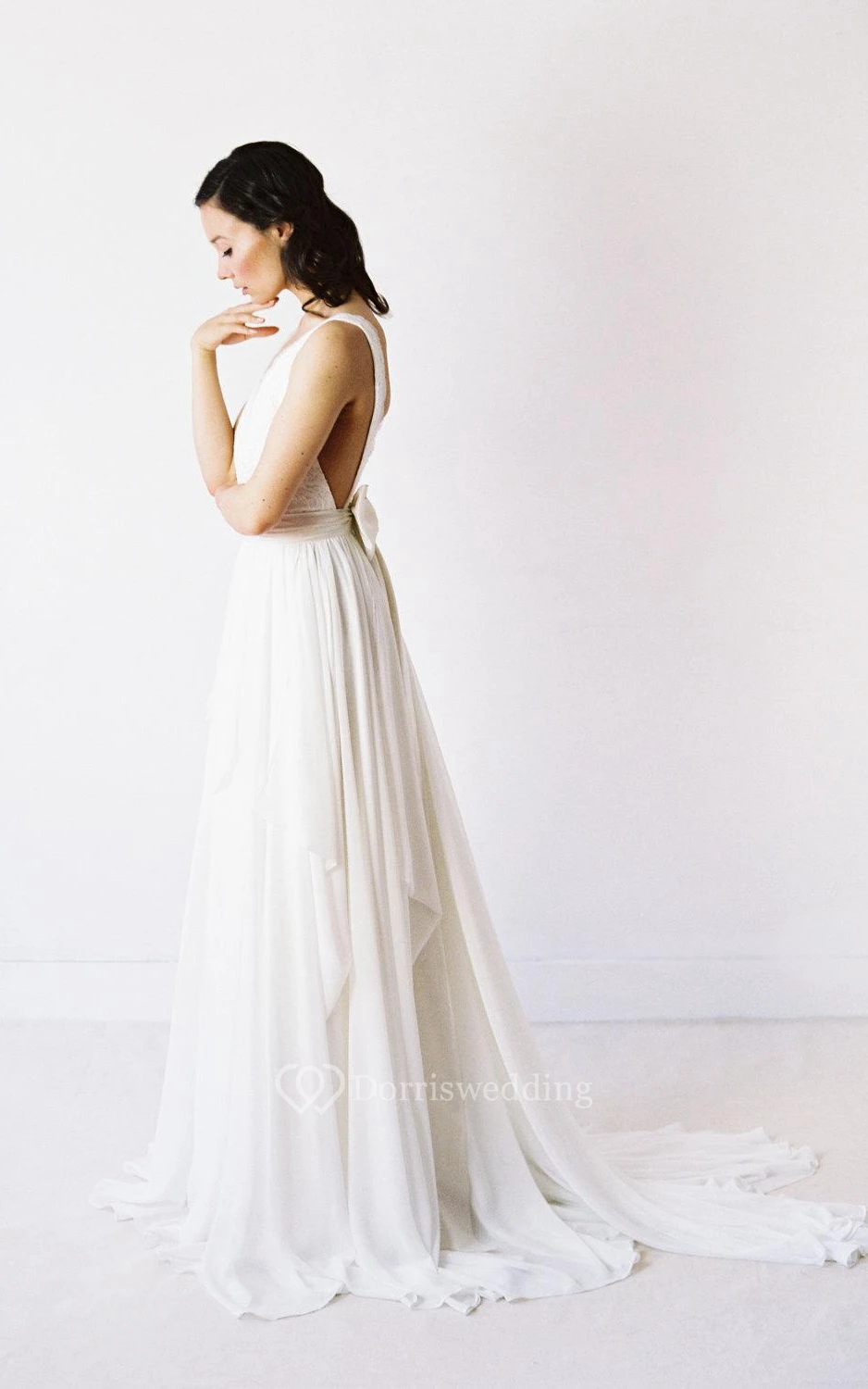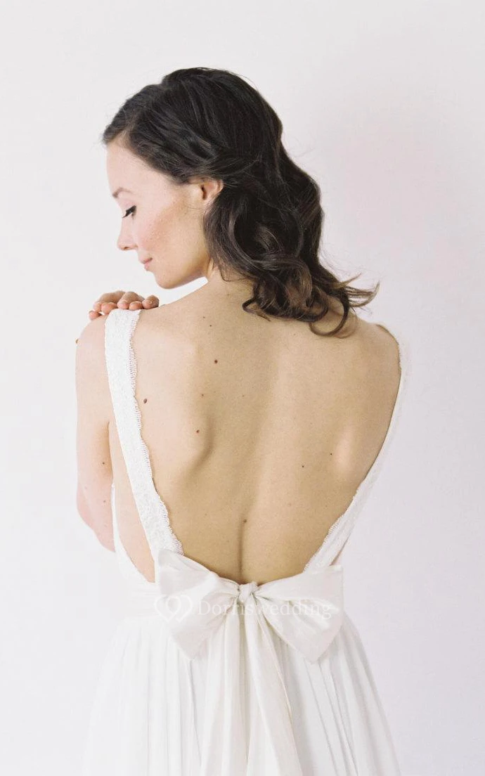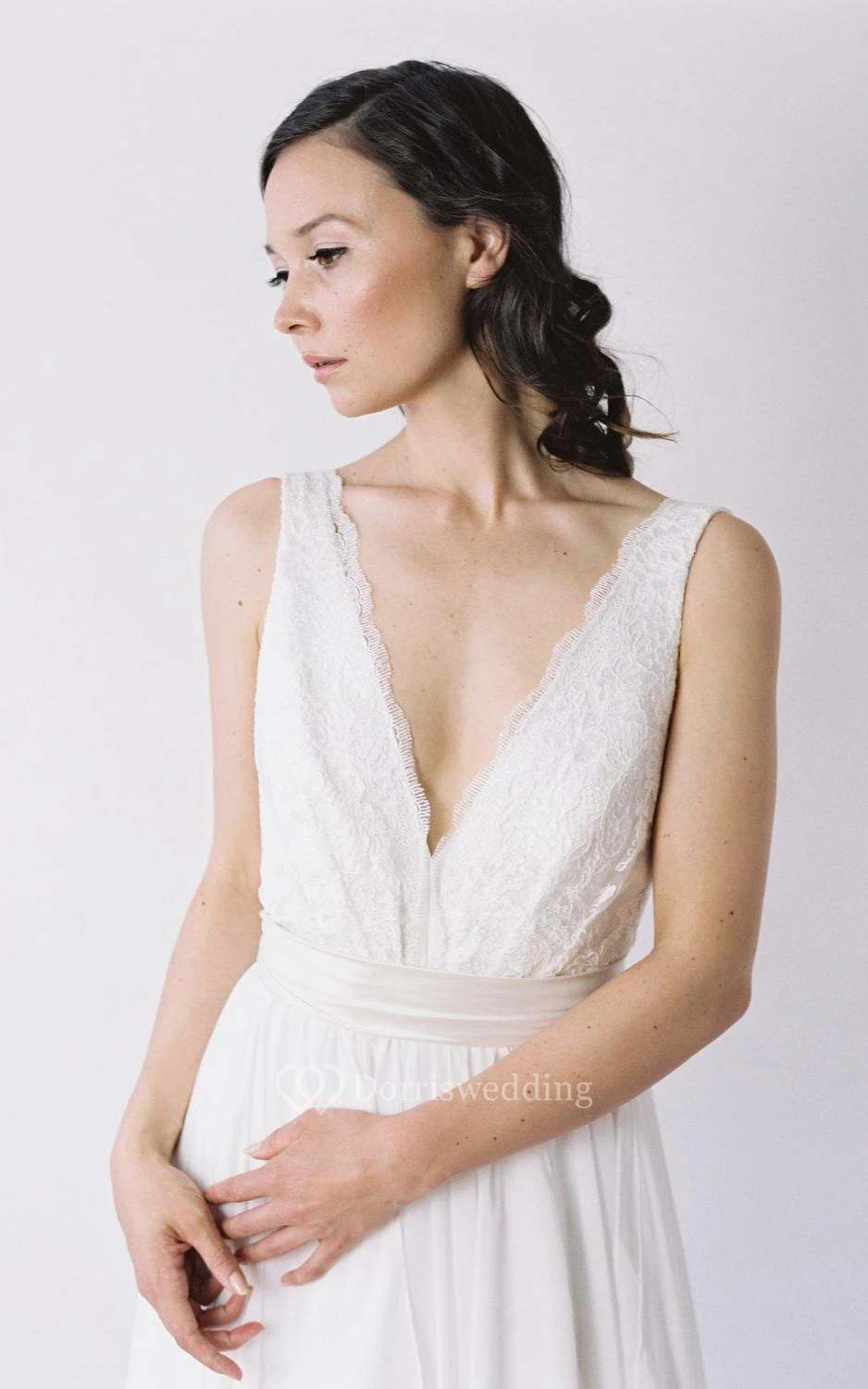 Sleeveless Deep-V Neck Chiffon Dress With Lace Bodice and Pleated Skirt