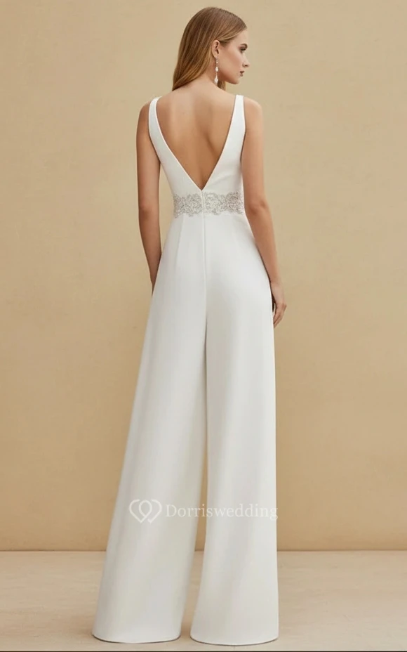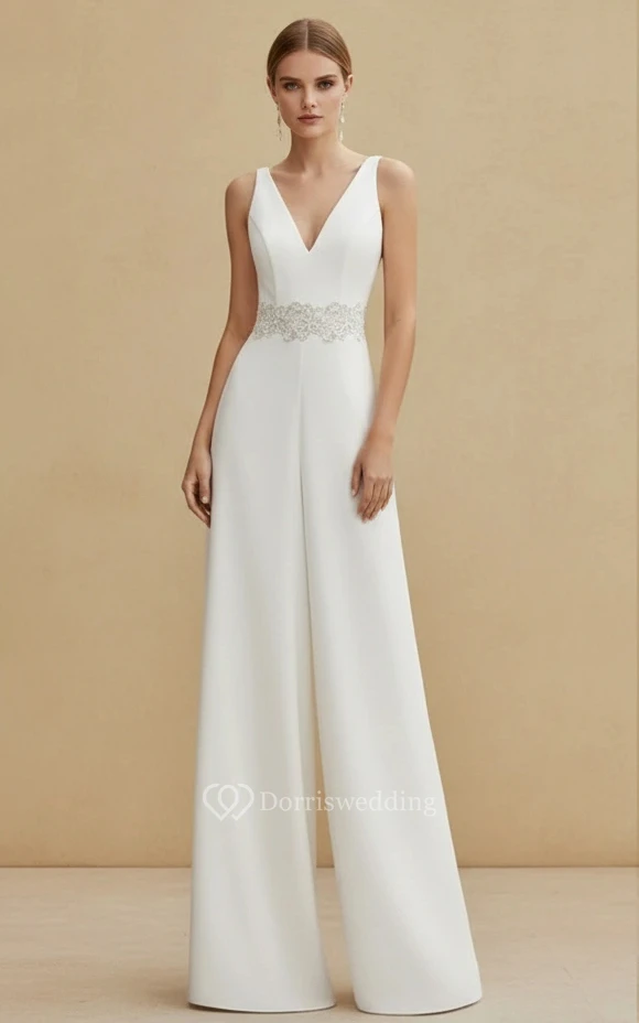 Sleeveless Deep V Neck Embroidered Waist Wide Leg Wedding Jumpsuit