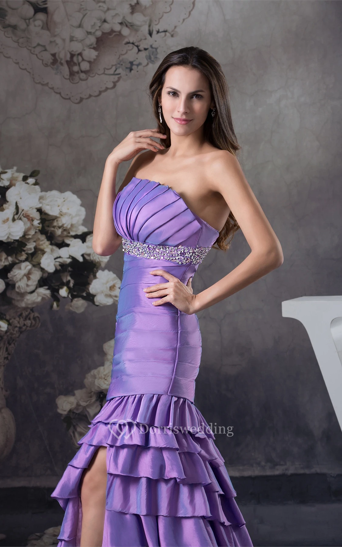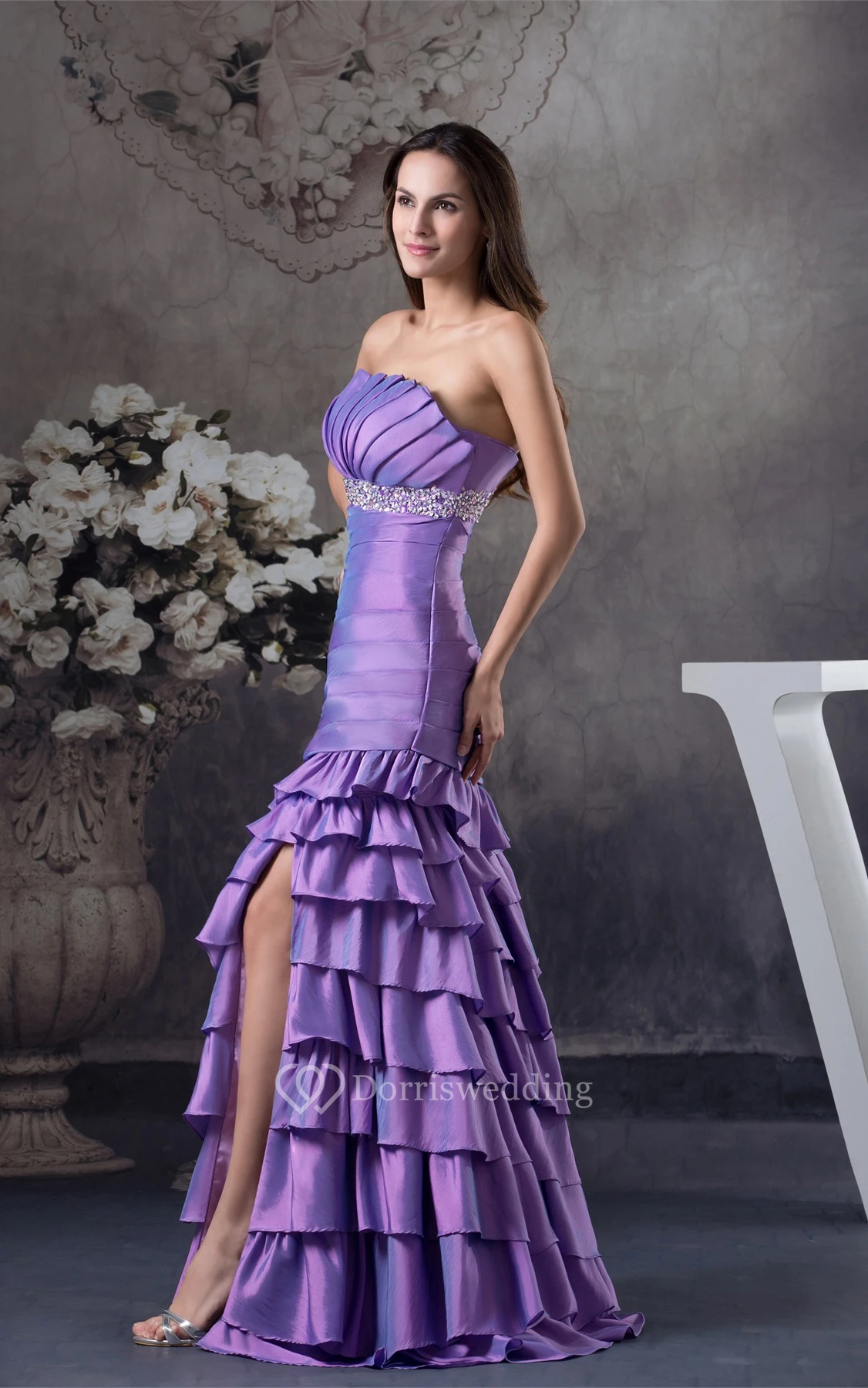 Sleeveless Front-Split Ruched Jeweled Waist and Dress With Tiers