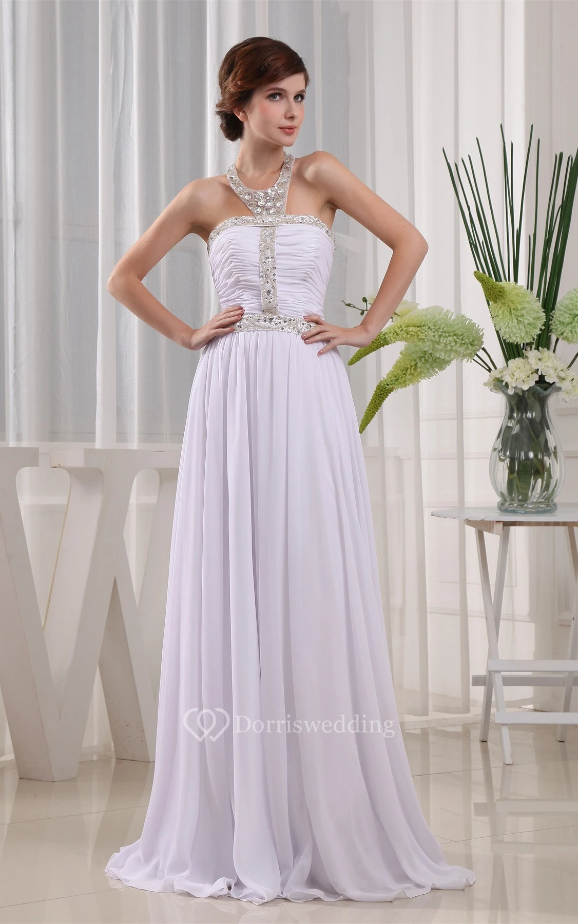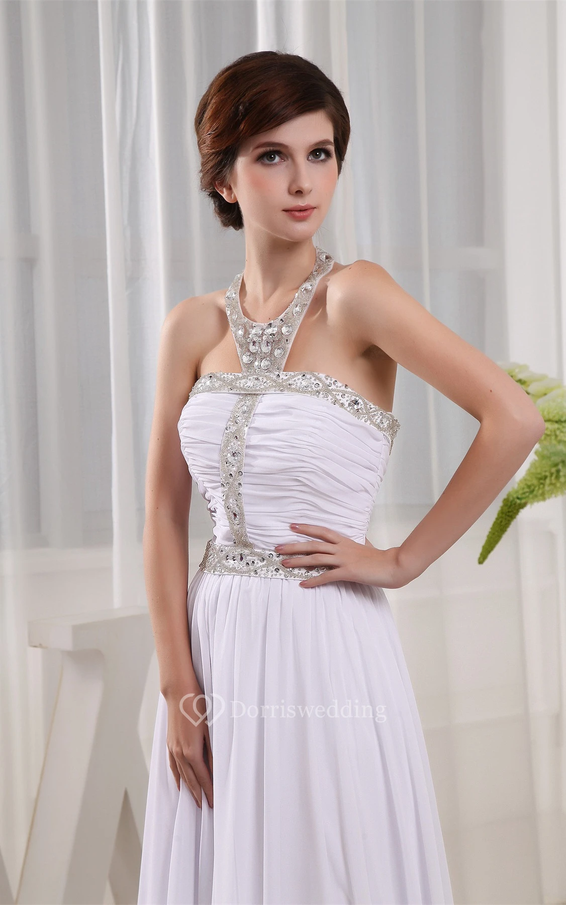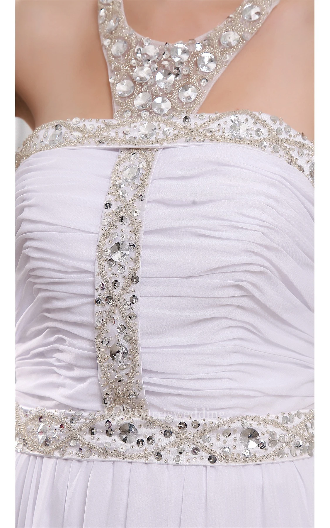 Sleeveless High Neck Ruched Dress With Pleats and Crystal Detailings
