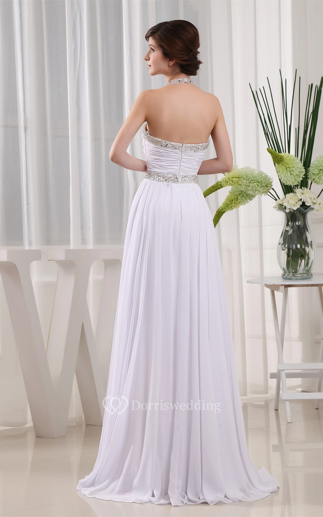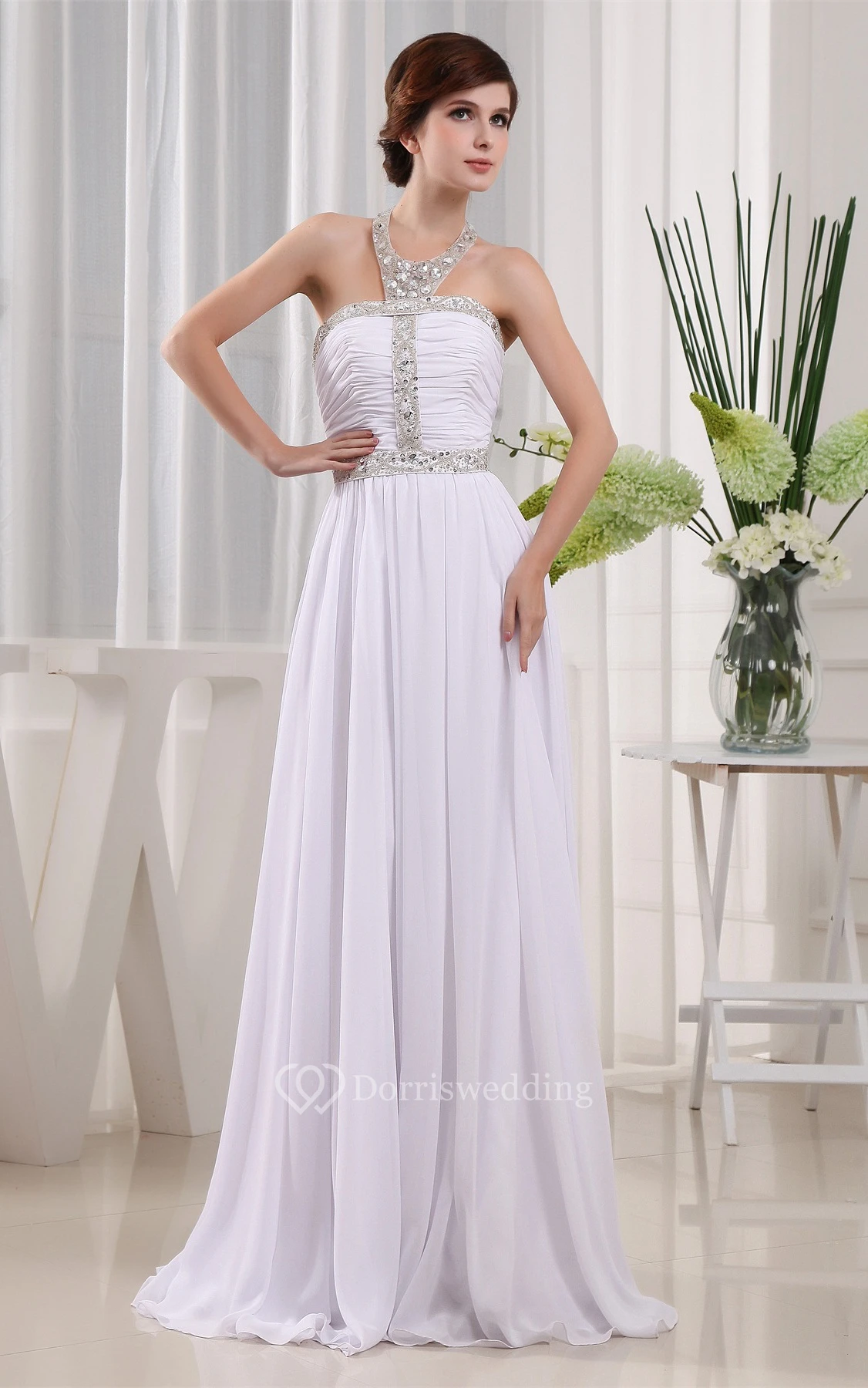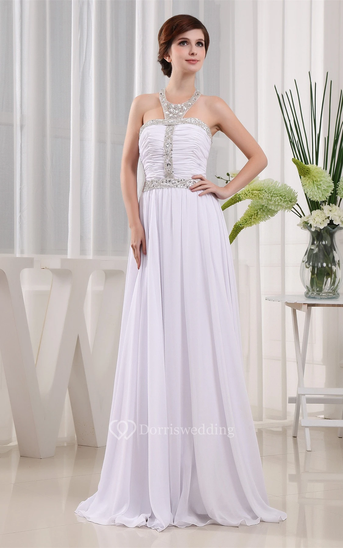 Sleeveless High Neck Ruched Dress With Pleats and Crystal Detailings