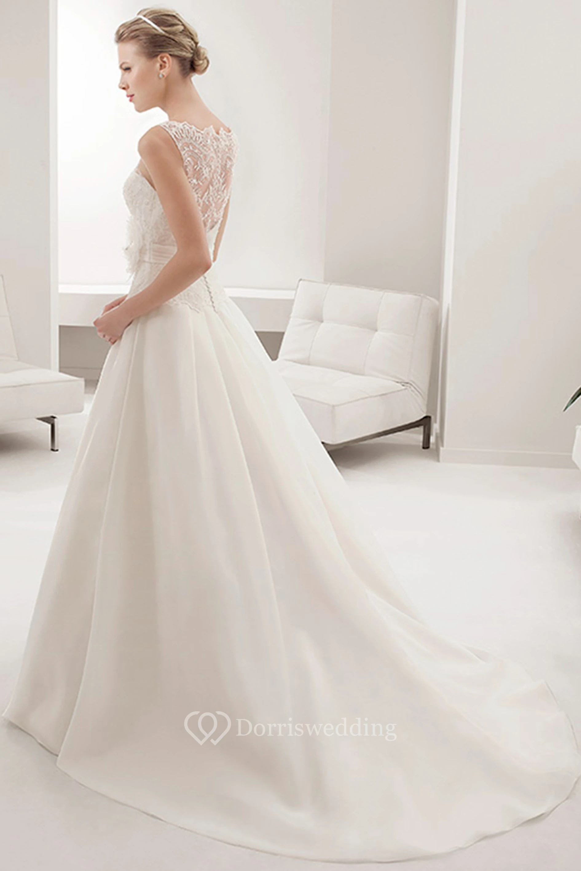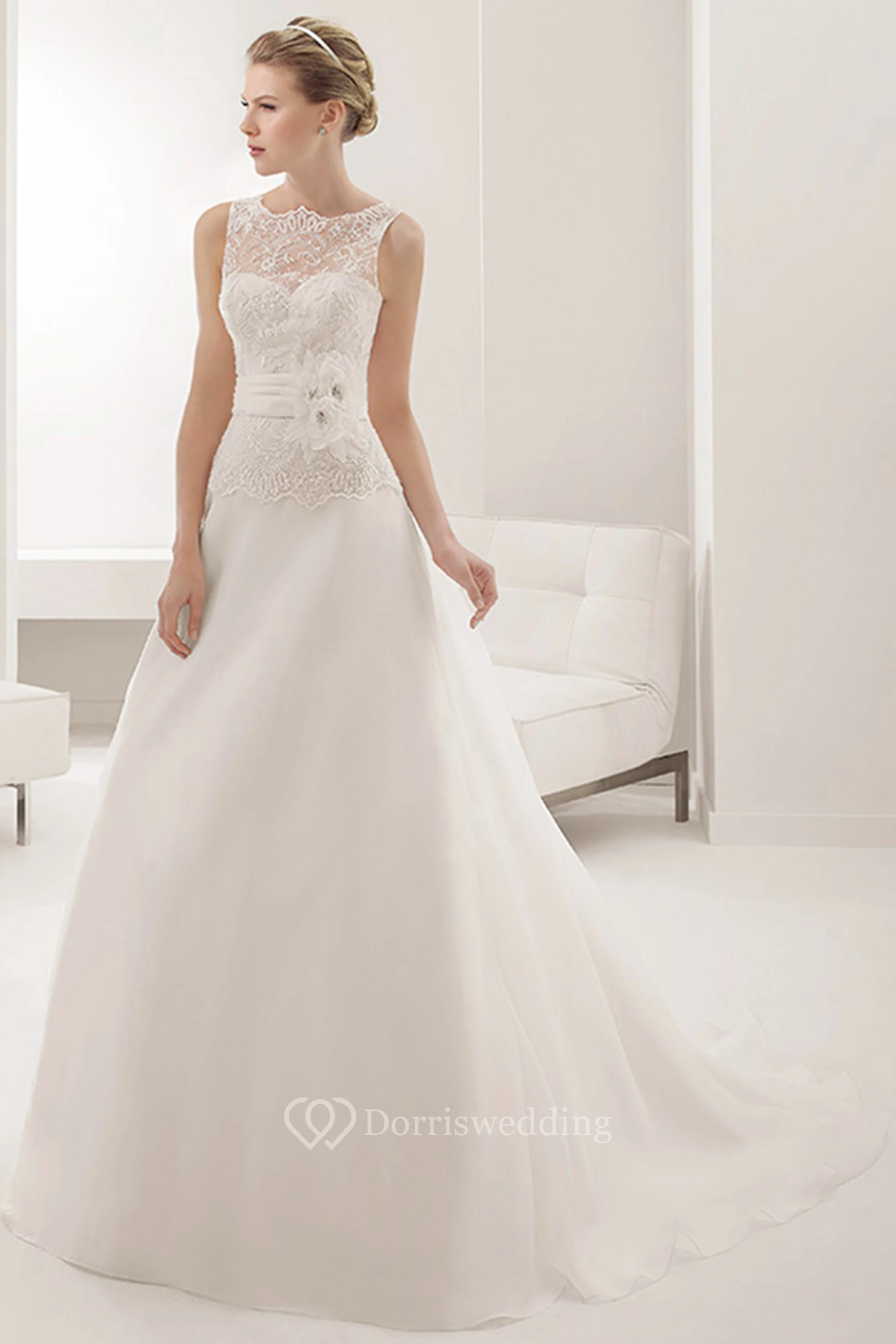 Sleeveless Illusion Neck A-line Wedding Gown With Waist Flower
