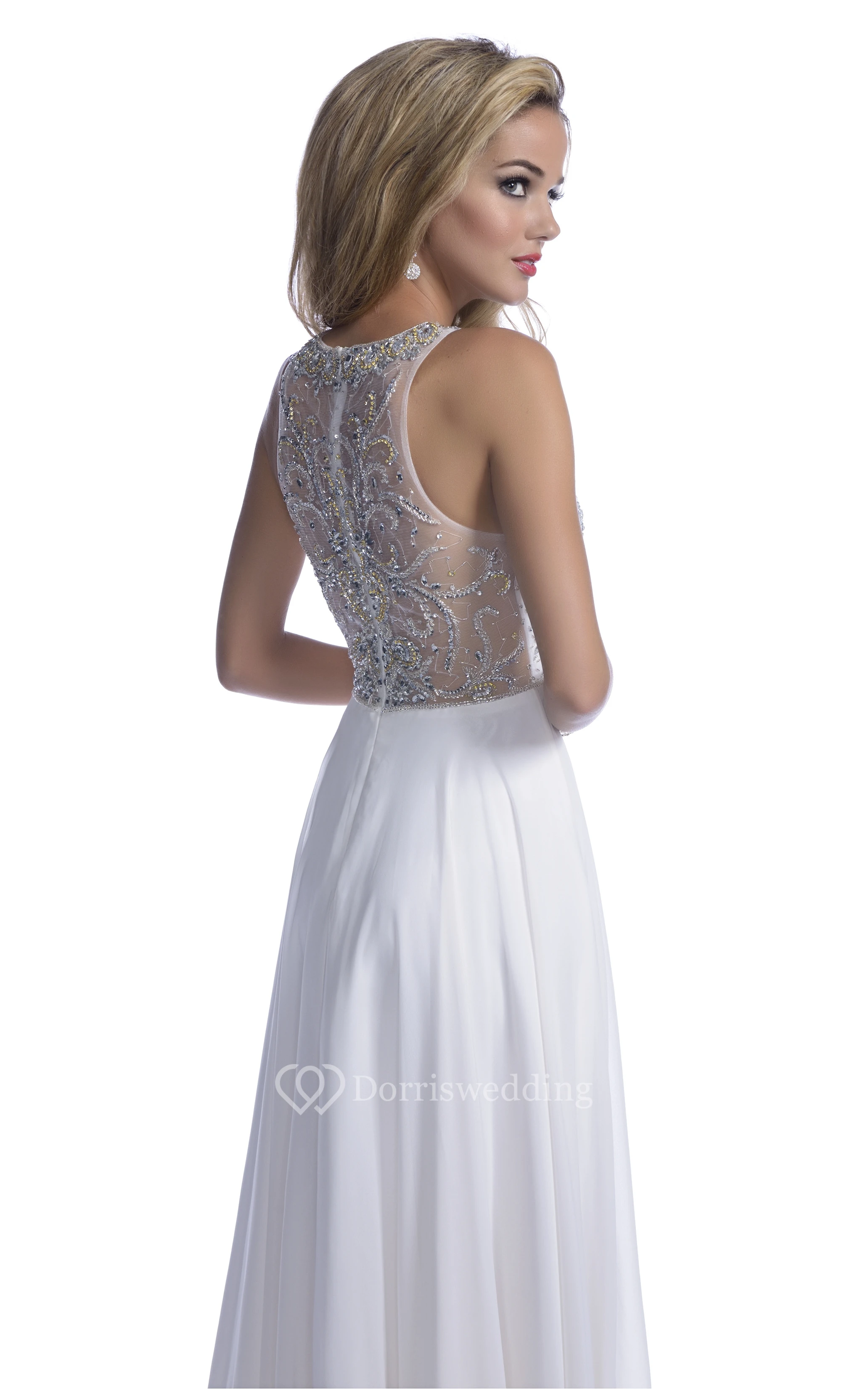 Sleeveless Jewel Neck A-Line Chiffon Prom Dress Featuring Rhinestone Bodice