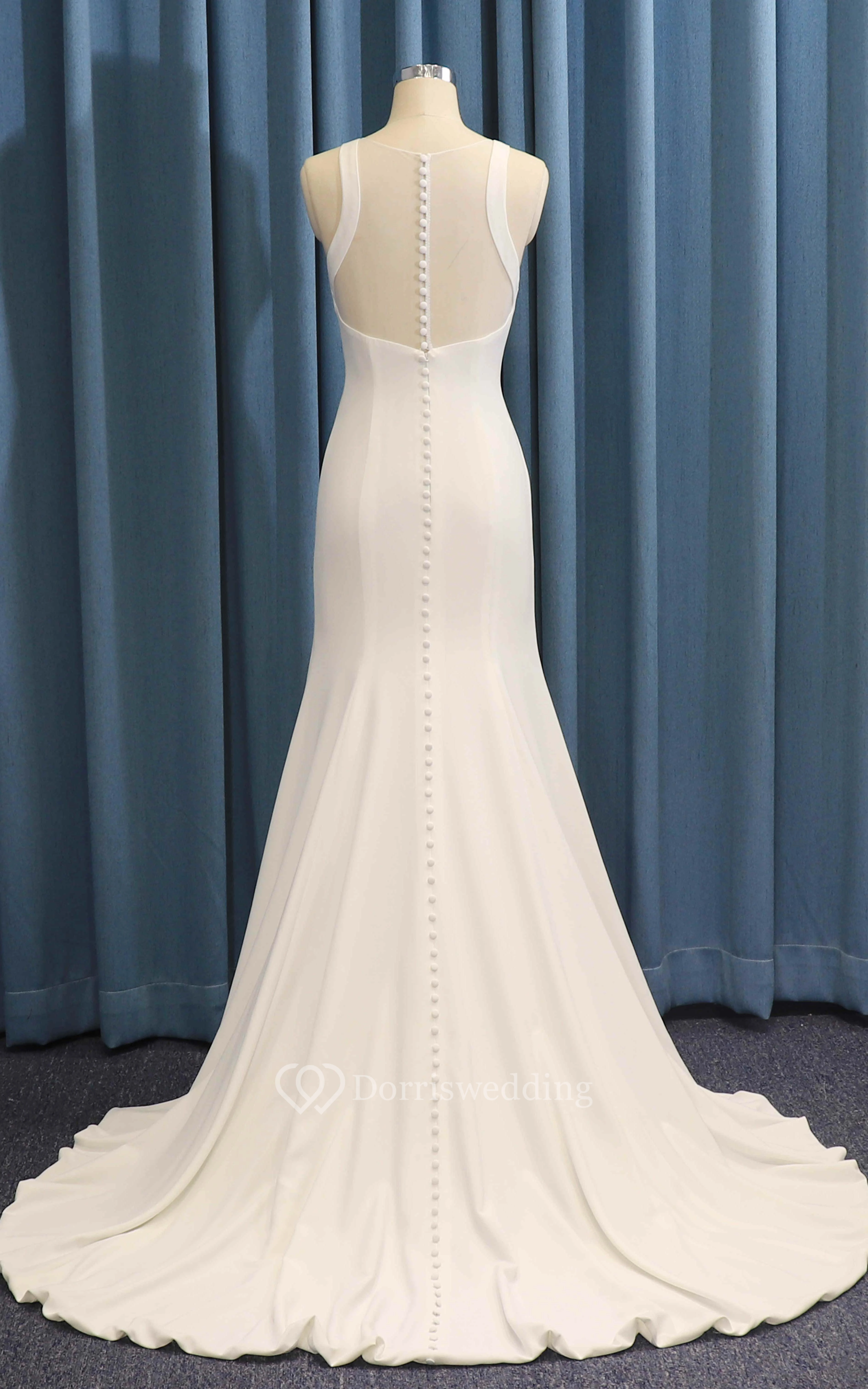 Sleeveless Jewel Neck Mermaid Satin Simple Wedding Dress With Ruching And Illusion Back With Buttons