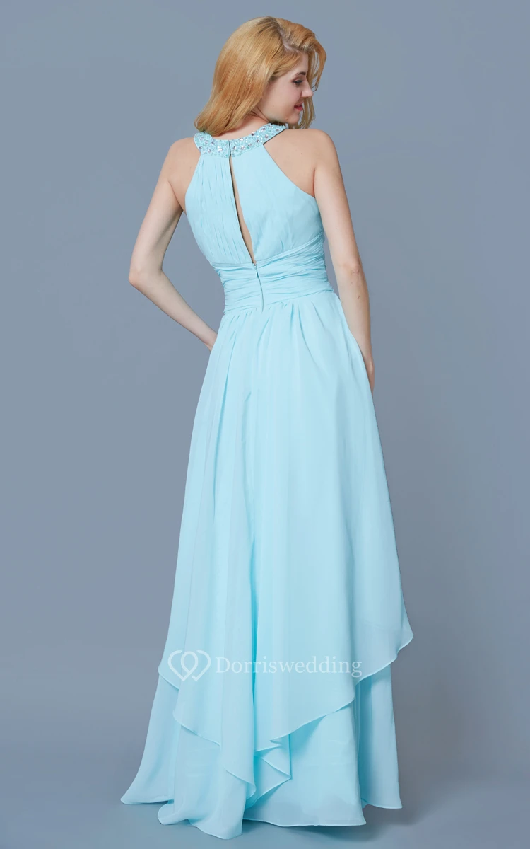 Sleeveless Jewel Neck Ruffled Long Chiffon Dress