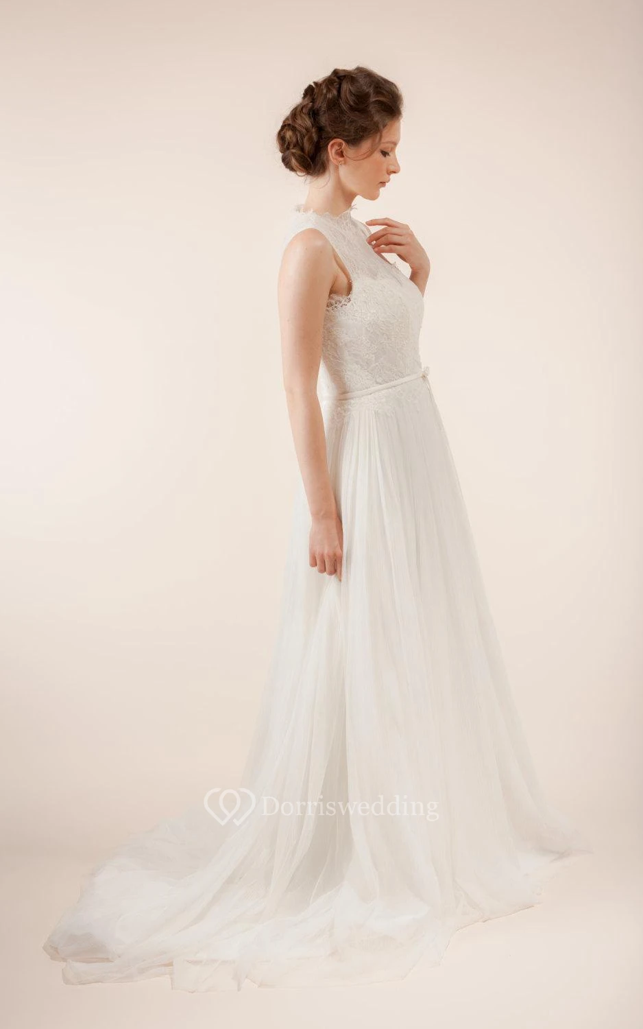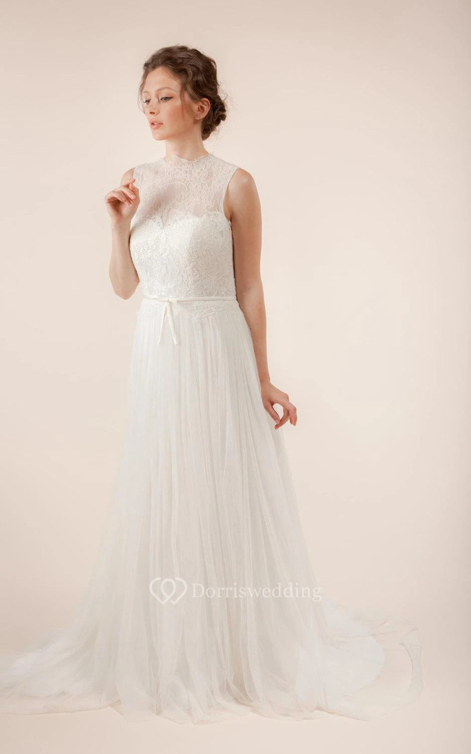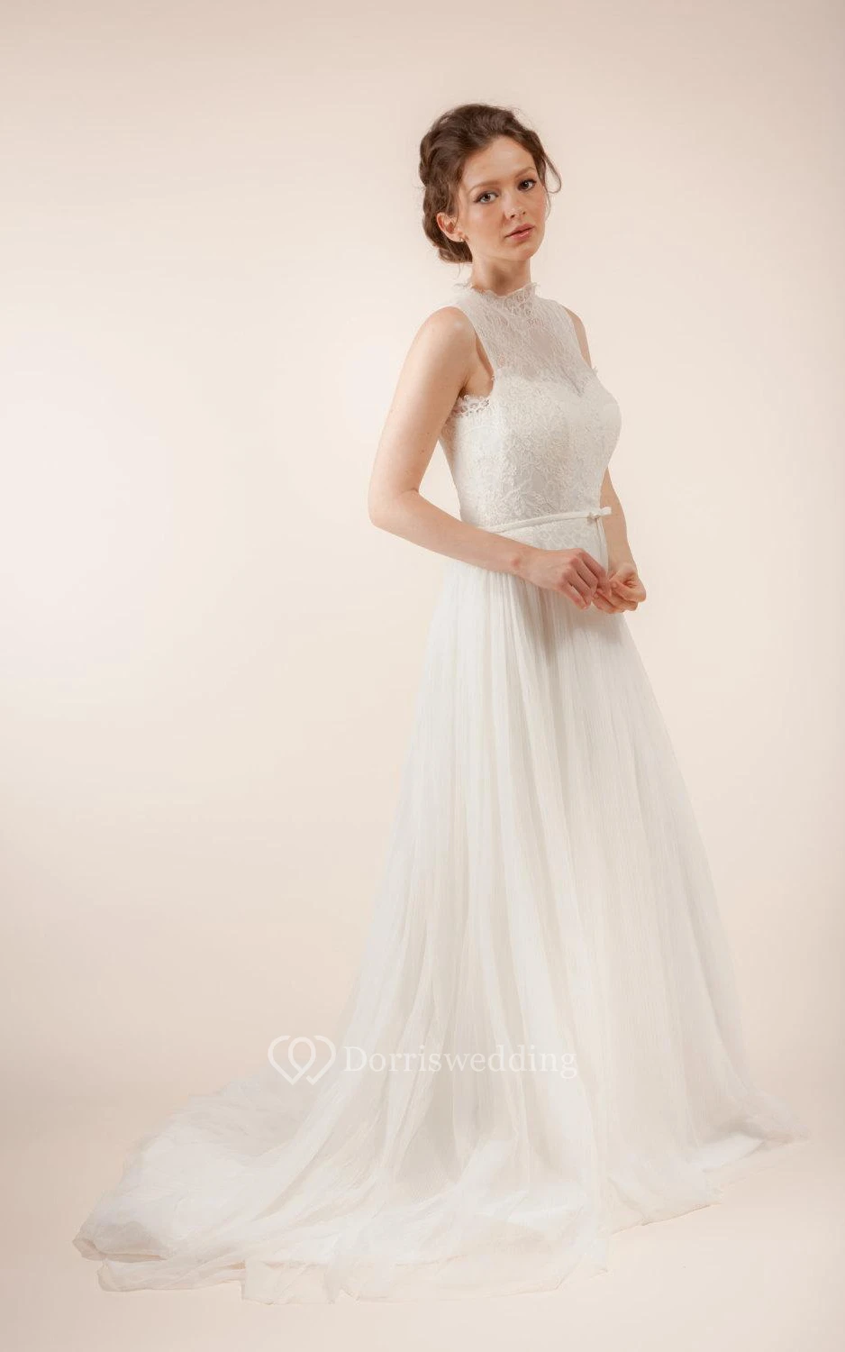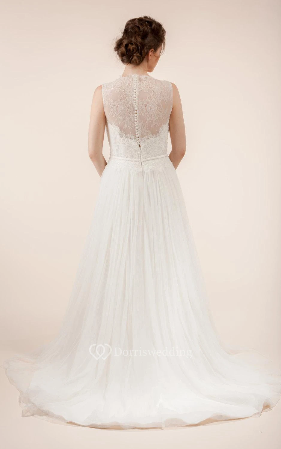 Sleeveless Lace and Tulle Dress With Pleats and Illusion Back