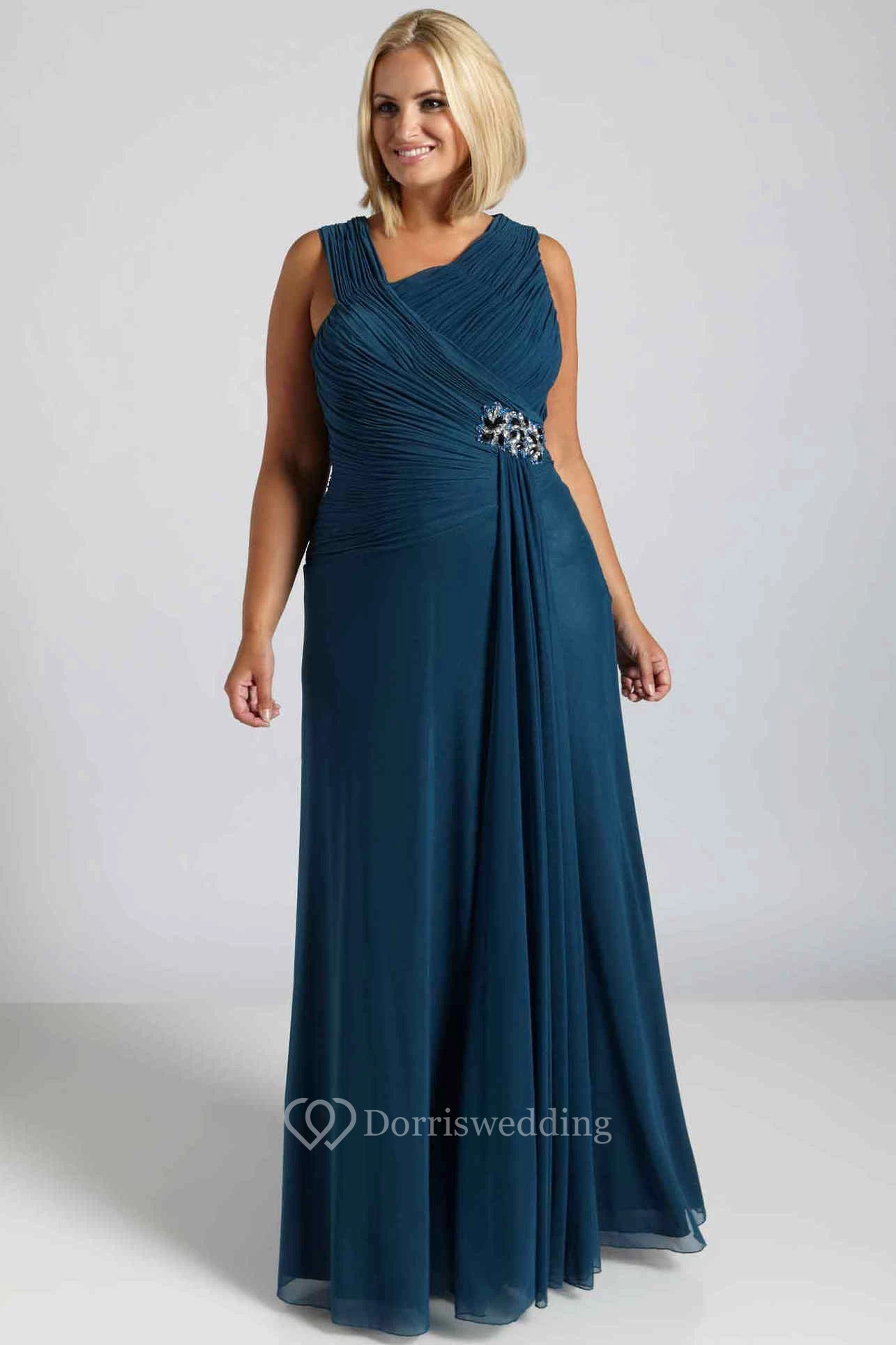 Sleeveless Long V-Neck Ruched Chiffon Plus Size Prom Dress With Broach