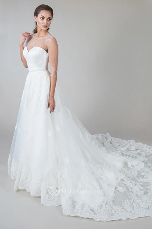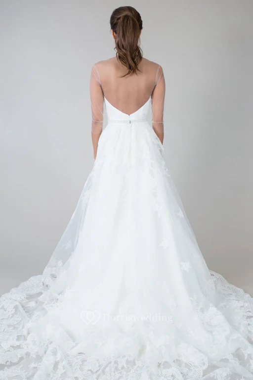 Sleeveless Maxi Scoop-Neck Appliqued Lace Wedding Dress With Waist Jewellery And Illusion