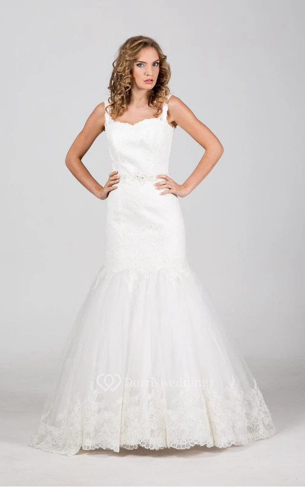 Sleeveless Mermaid Lace Dress With Straps and Beaded Waist