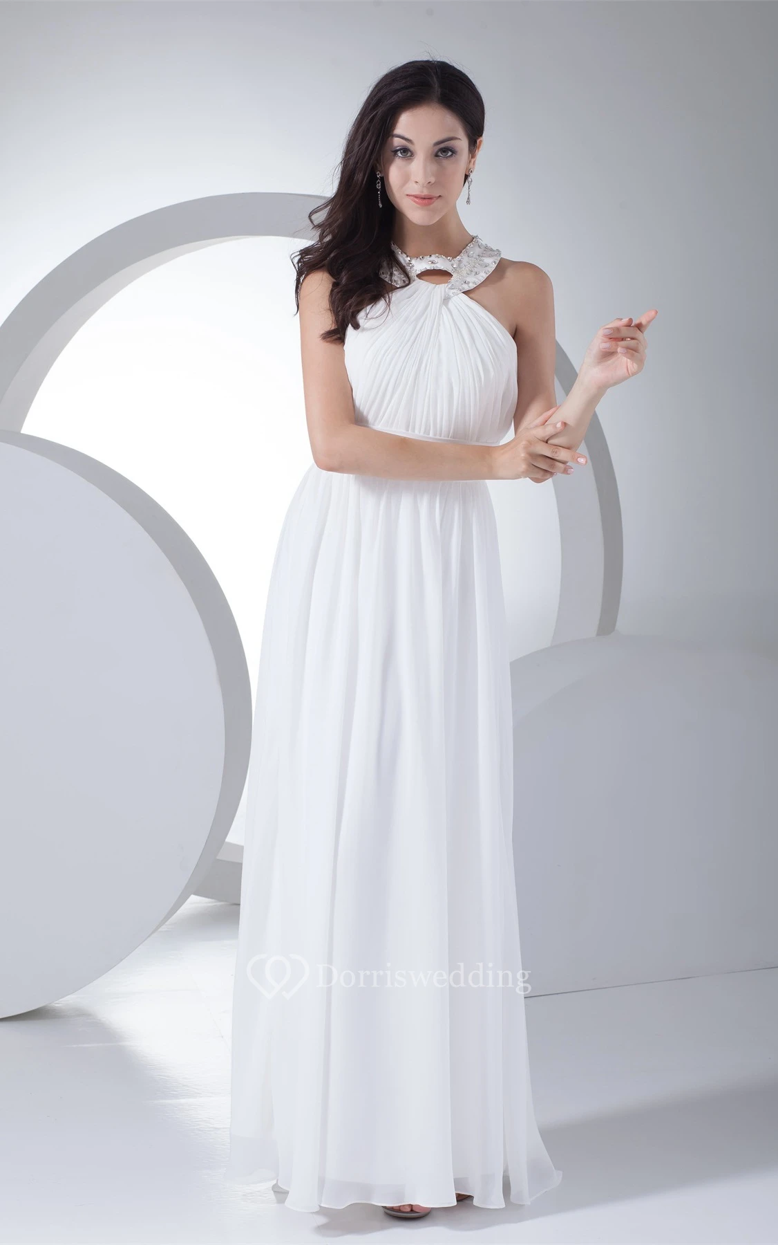 Sleeveless Pleated Floor-Length Chiffon Dress With Jeweled Neckline
