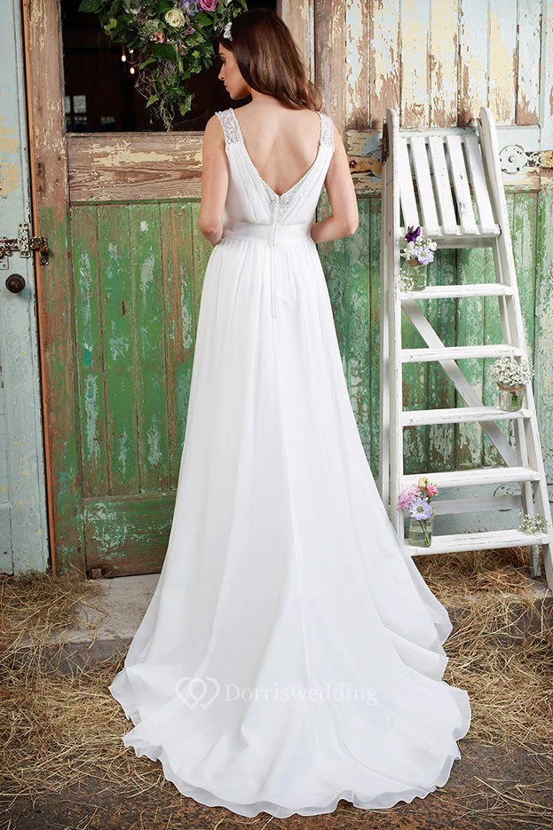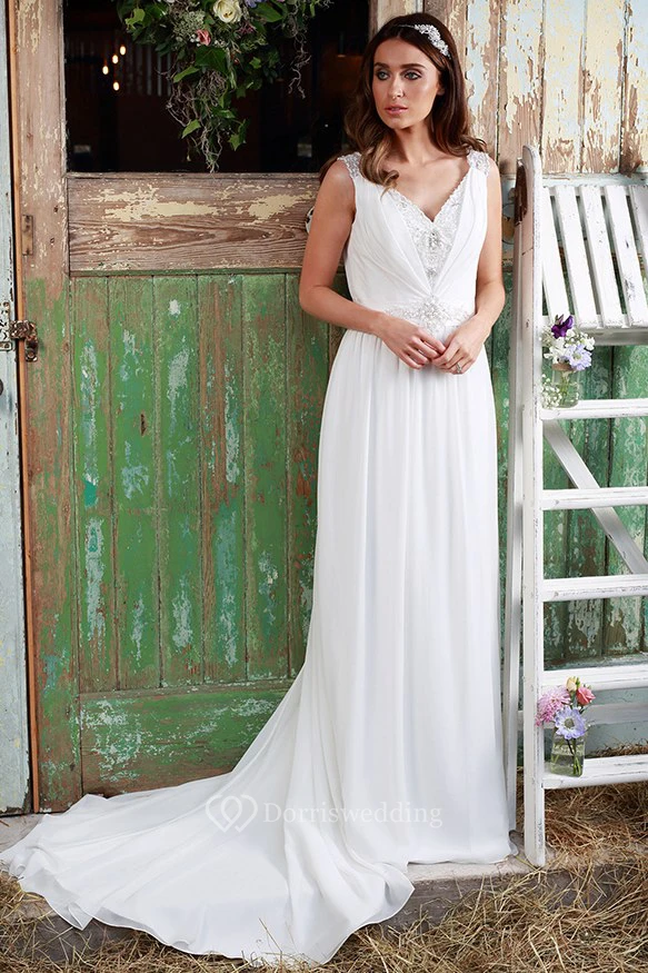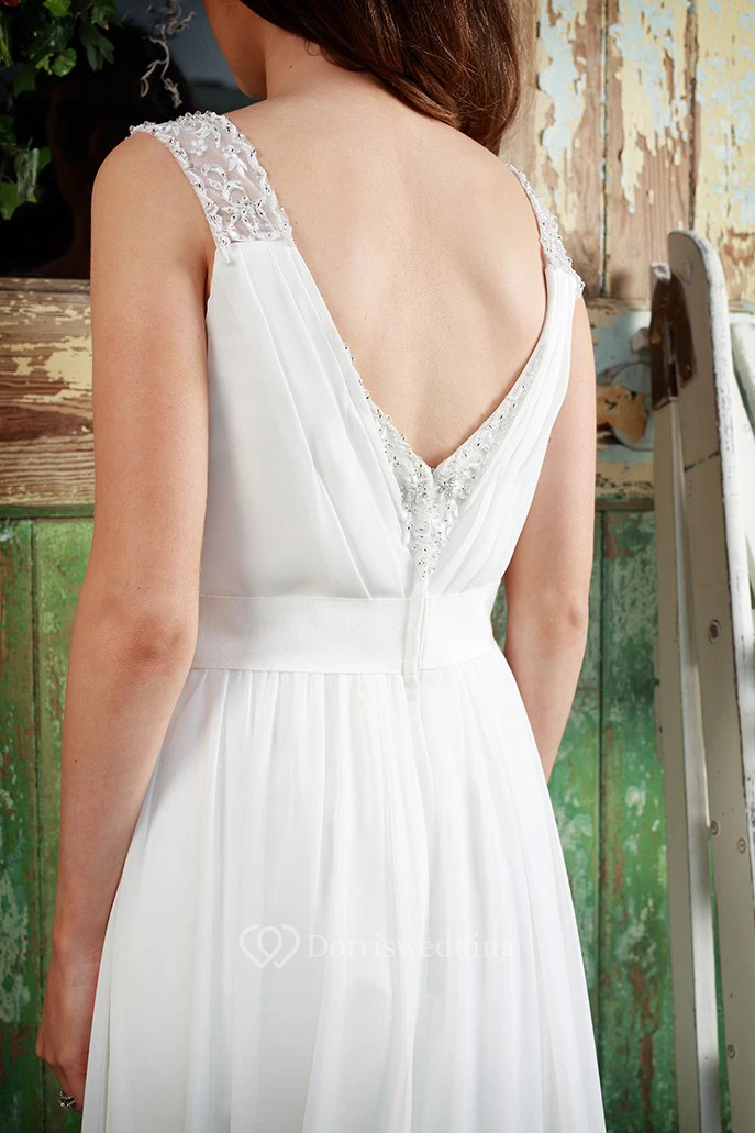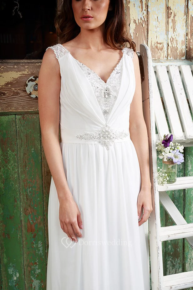 Sleeveless Ruched V-Neck Chiffon Wedding Dress With Beading