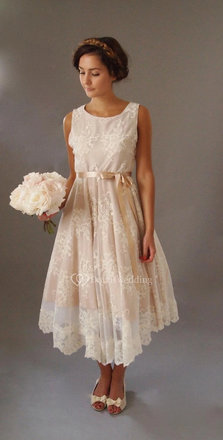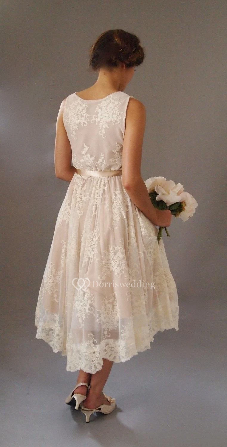 Sleeveless Scoop Neck A-Line Lace Tea Length Dress With Satin Bow Sash