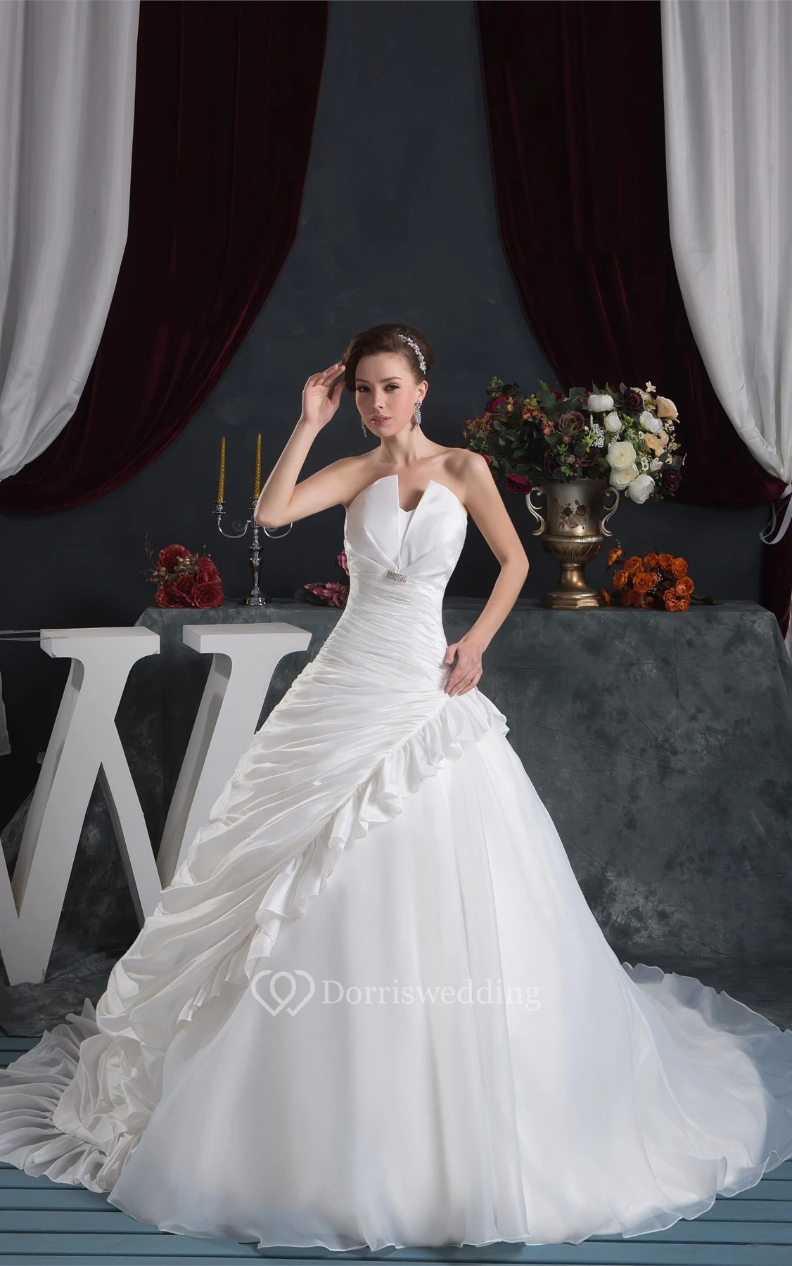 Sleeveless Side-Ruched Flower and Ball-Gown With Broach