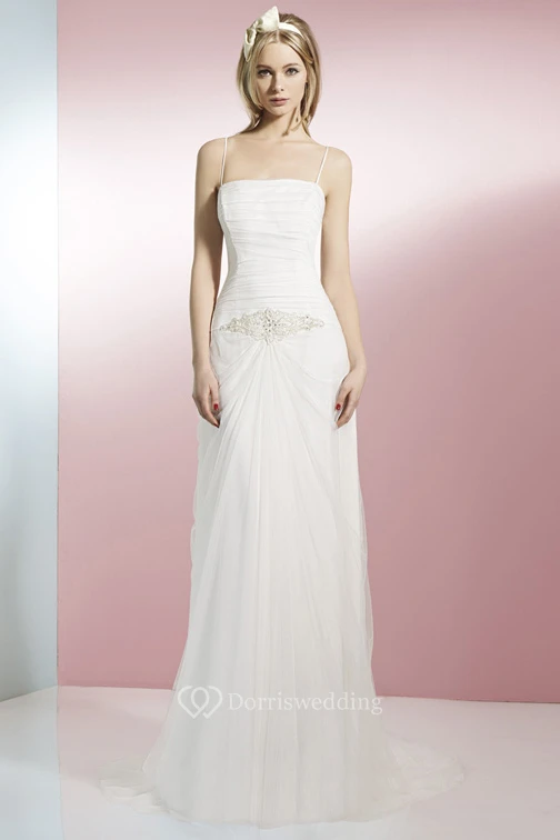Sleeveless Spaghetti Jeweled Long Wedding Dress With Low-V Back And Draping