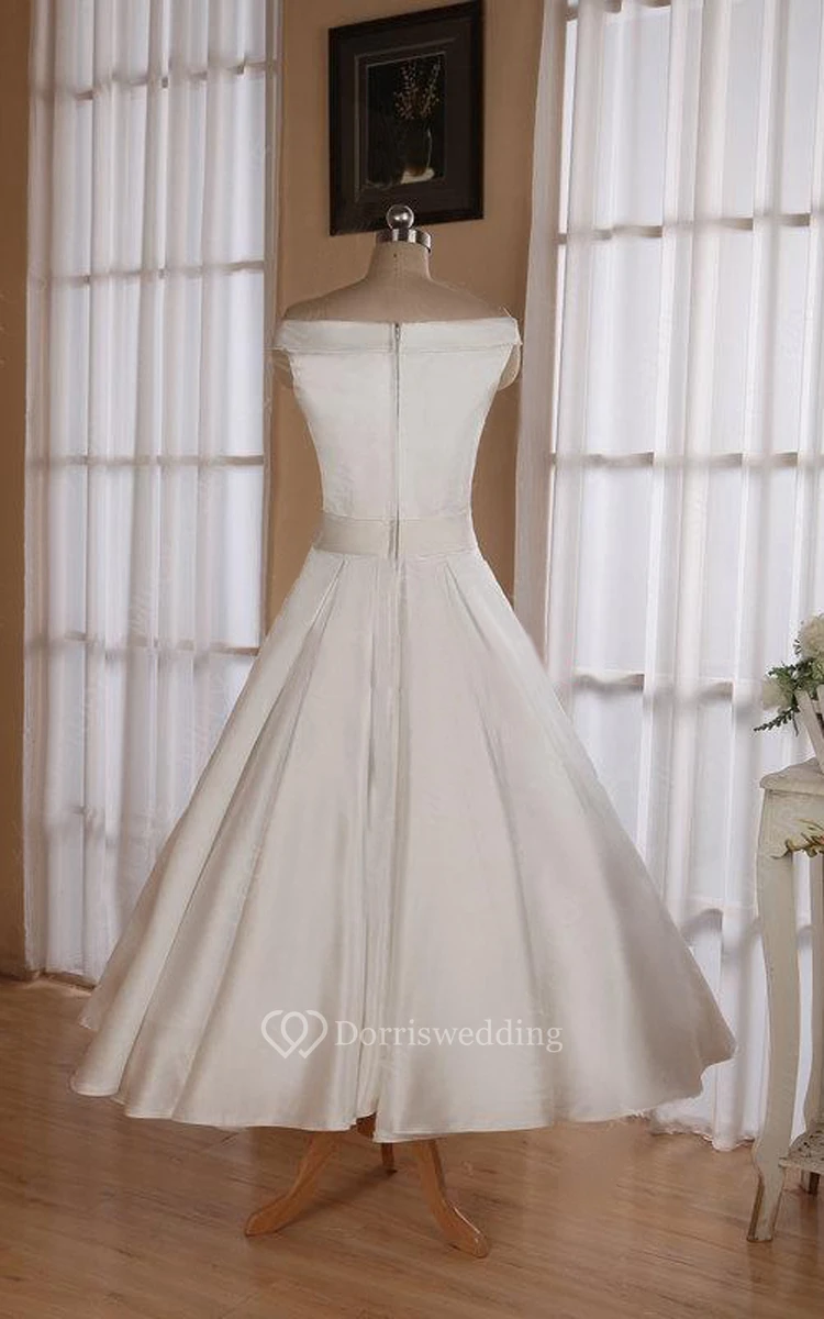 Sleeveless Tea-Length Satin Short Wedding Dress With Sash And Off-The-Shoulder Neck