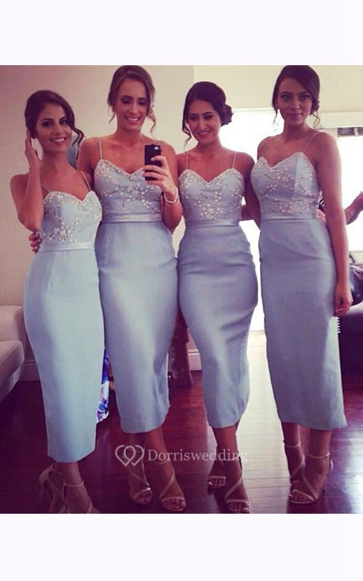 Sleeveless Tea-length Sheath Taffeta Dress with Spaghetti Straps