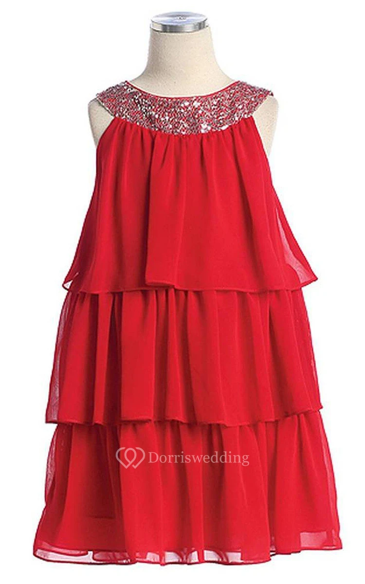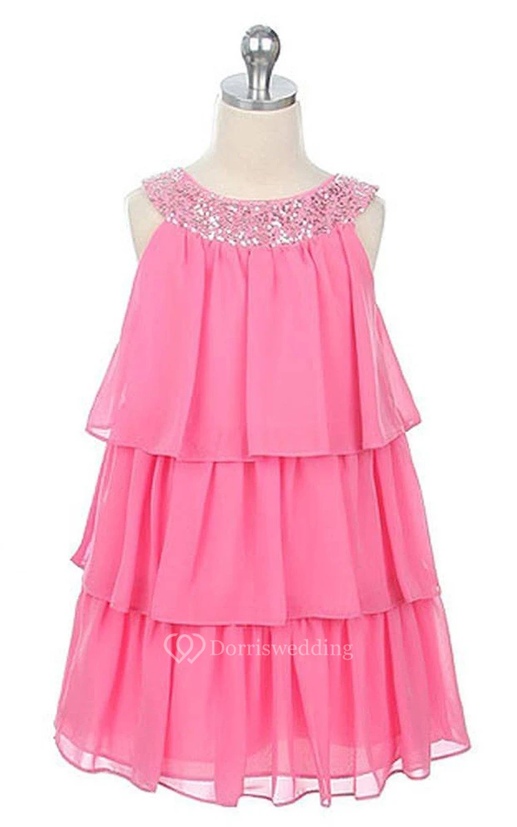 Sleeveless Tiered Dress With Sequined Neckline