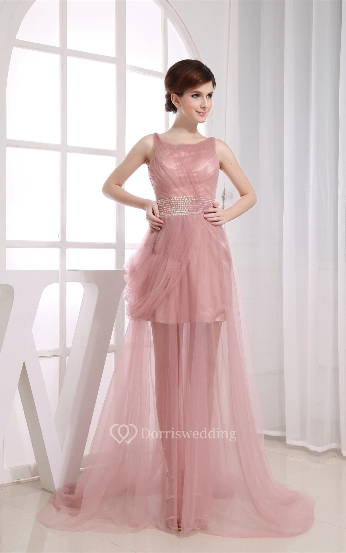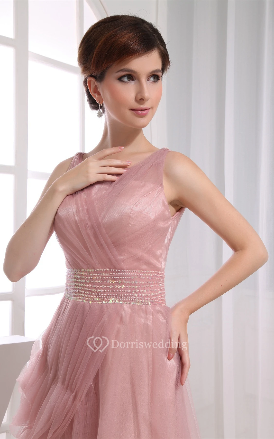 Sleeveless Tulle A-Line V-Neck Jeweled Waist and Dress With Ruching
