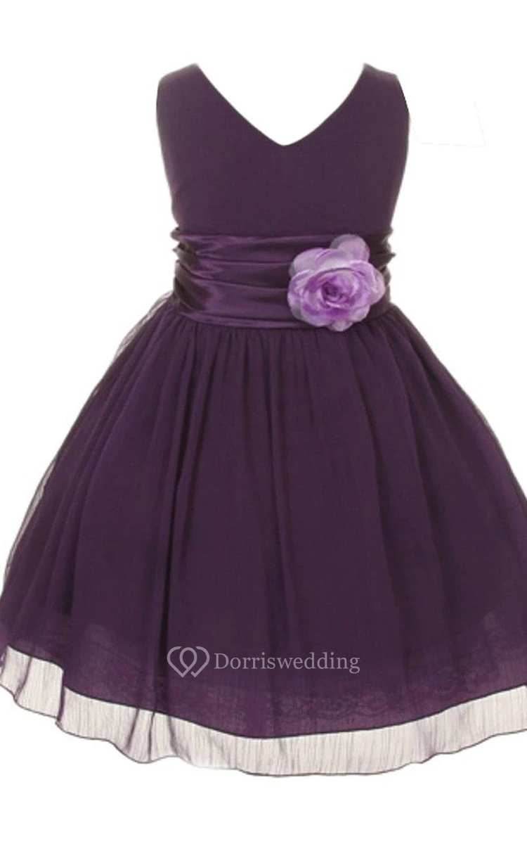 Sleeveless V-neck A-line Dress With Flower and Pleats