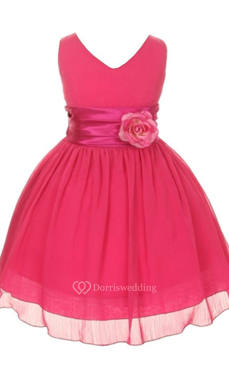 Sleeveless V-neck A-line Dress With Pleats and Flower