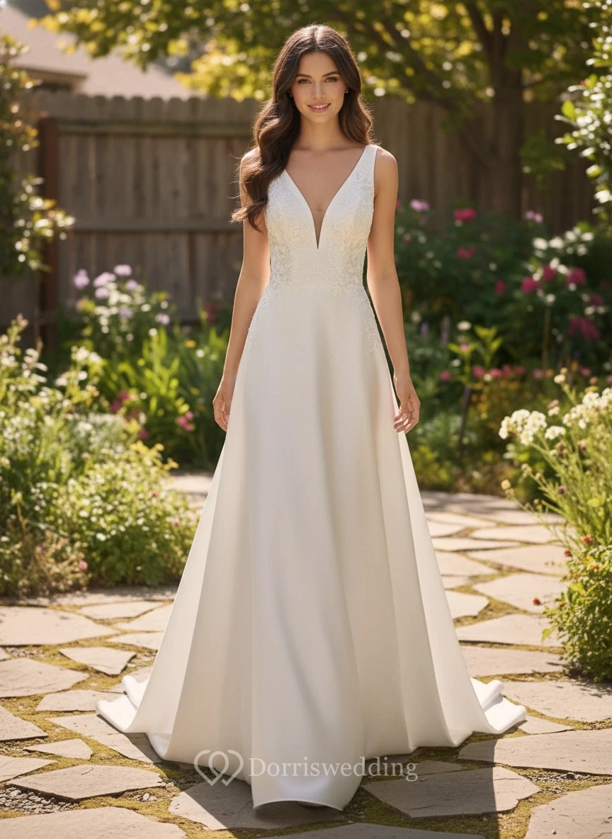 Sleeveless V-Neck A-line Satin Wedding Dress