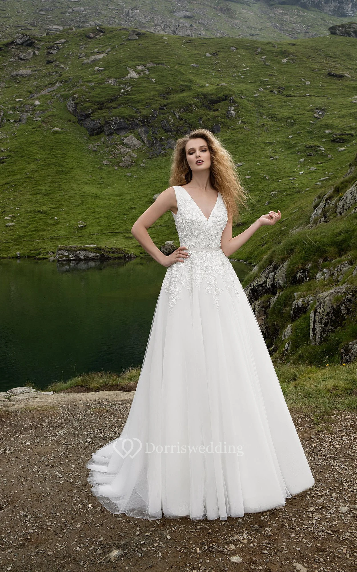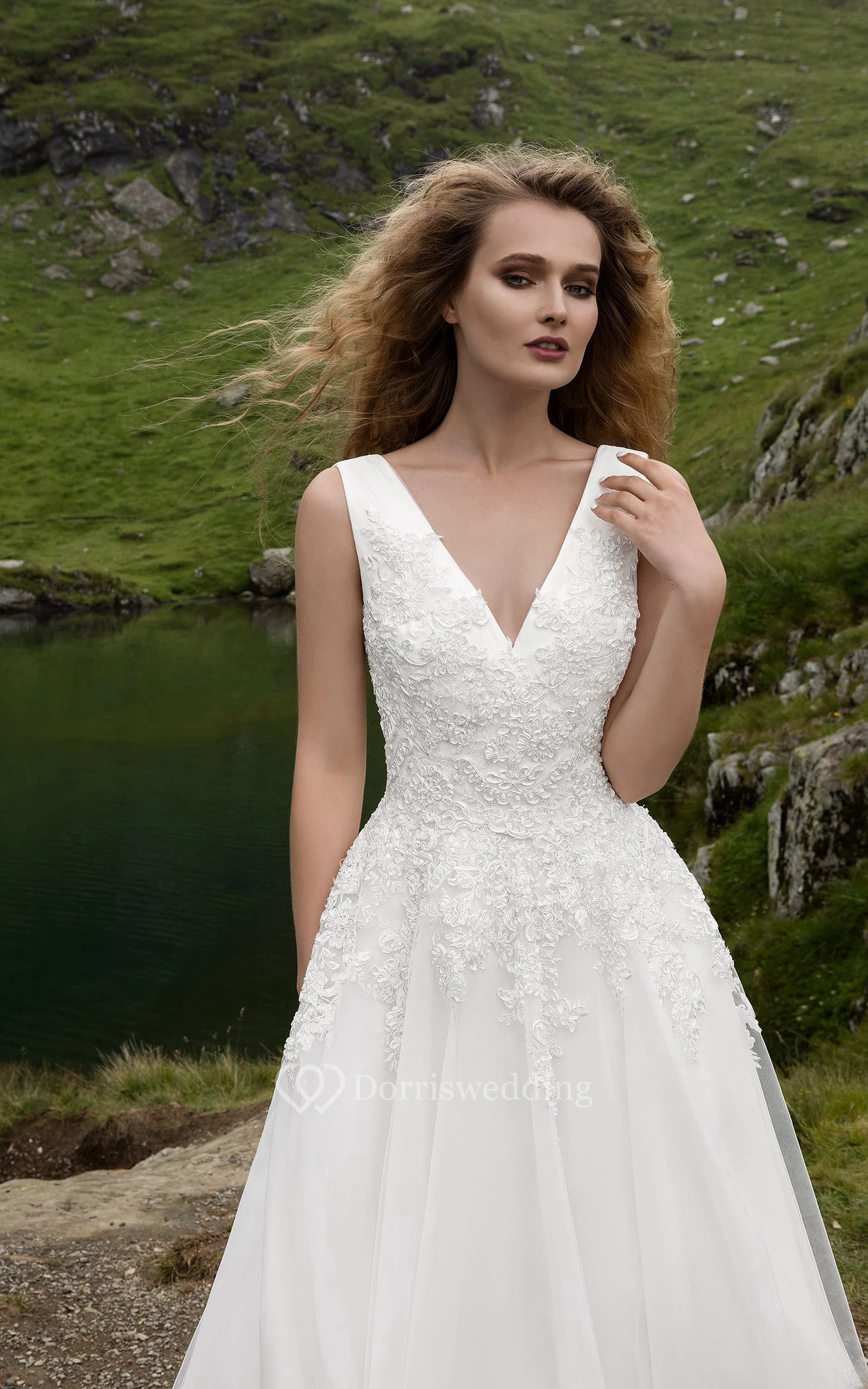 Sleeveless V-neck Appliques Tulle Dress With Low V Back