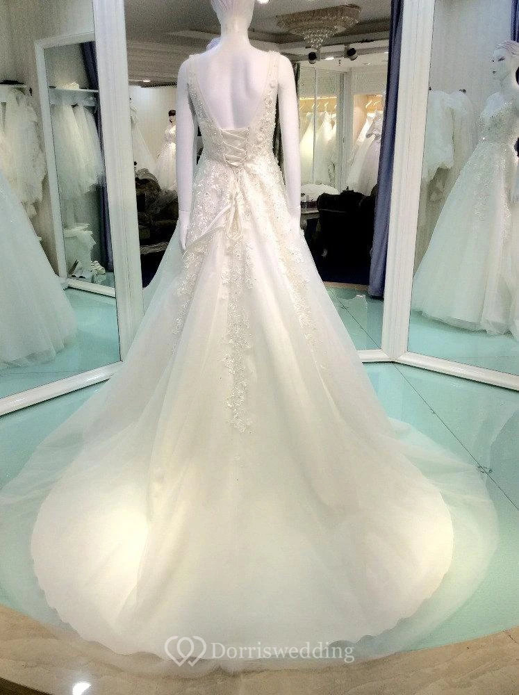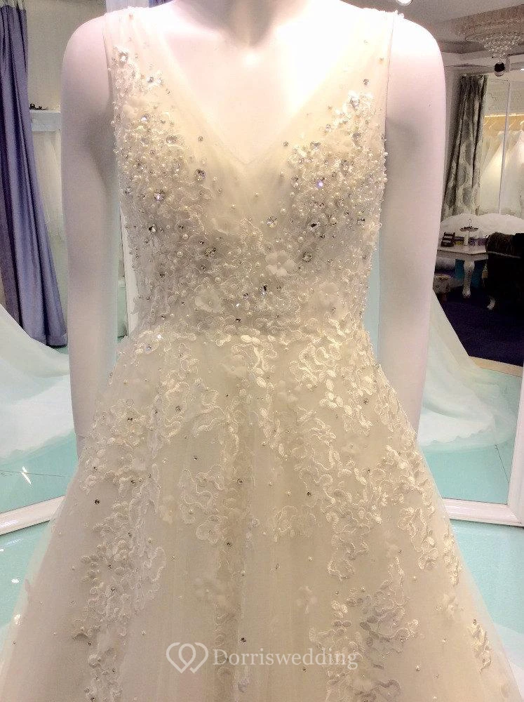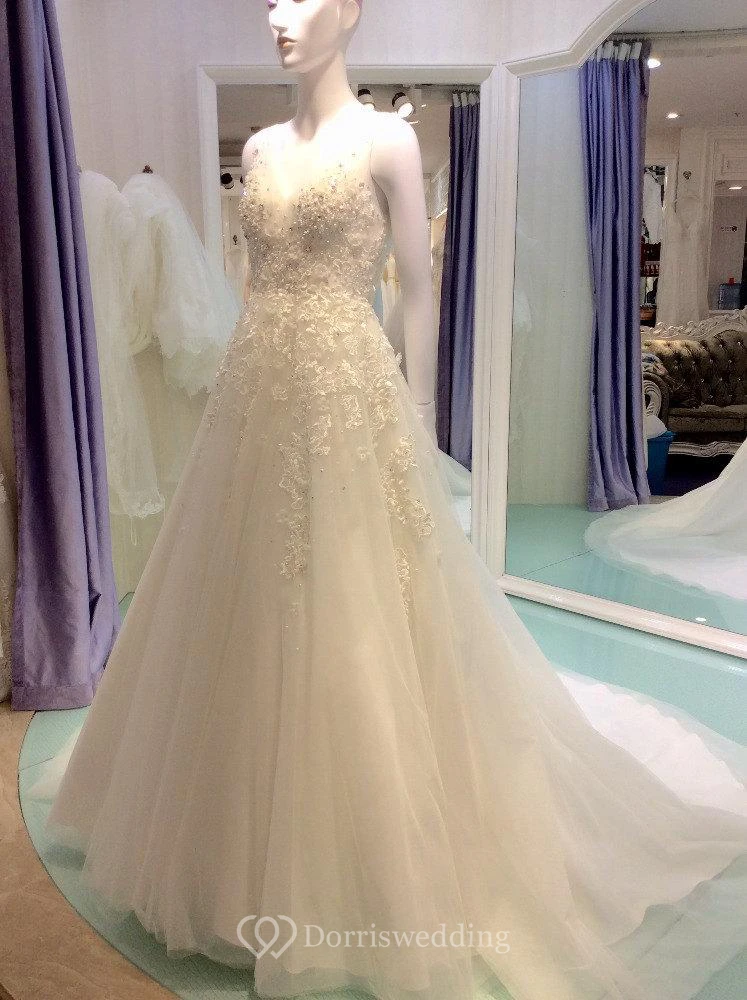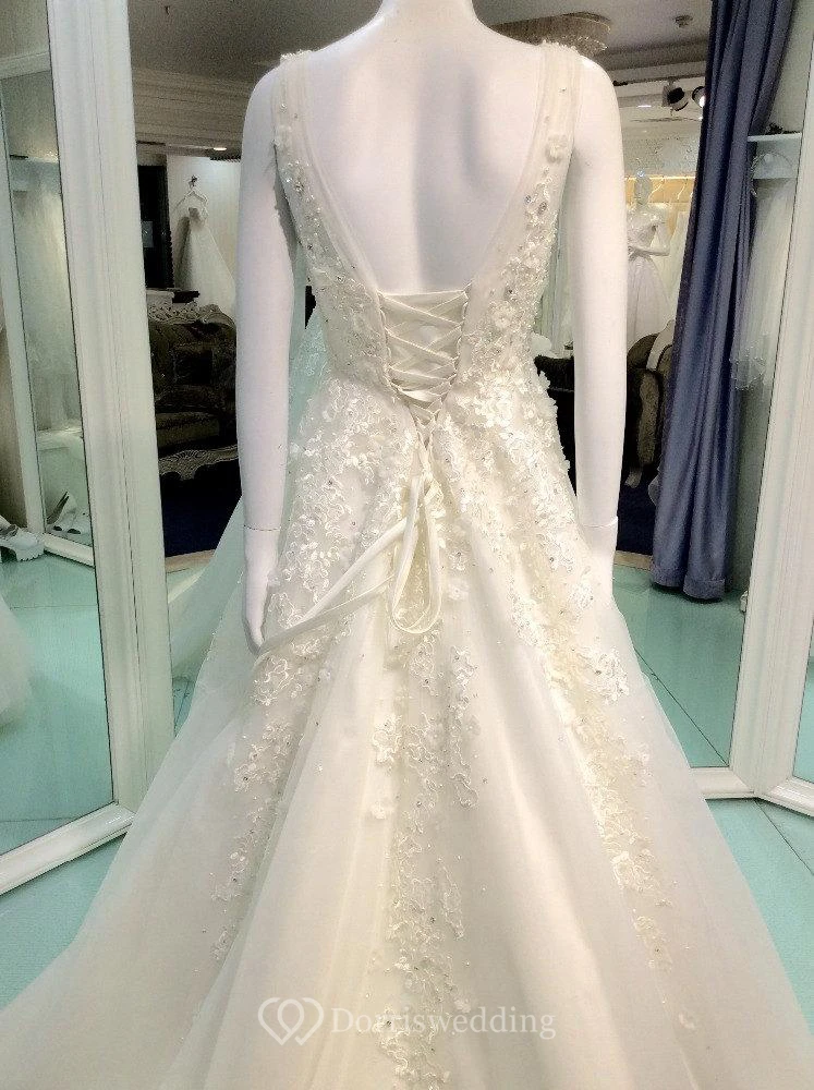 Sleeveless V-Neck Beaded Lace and Tulle A-Line Dress