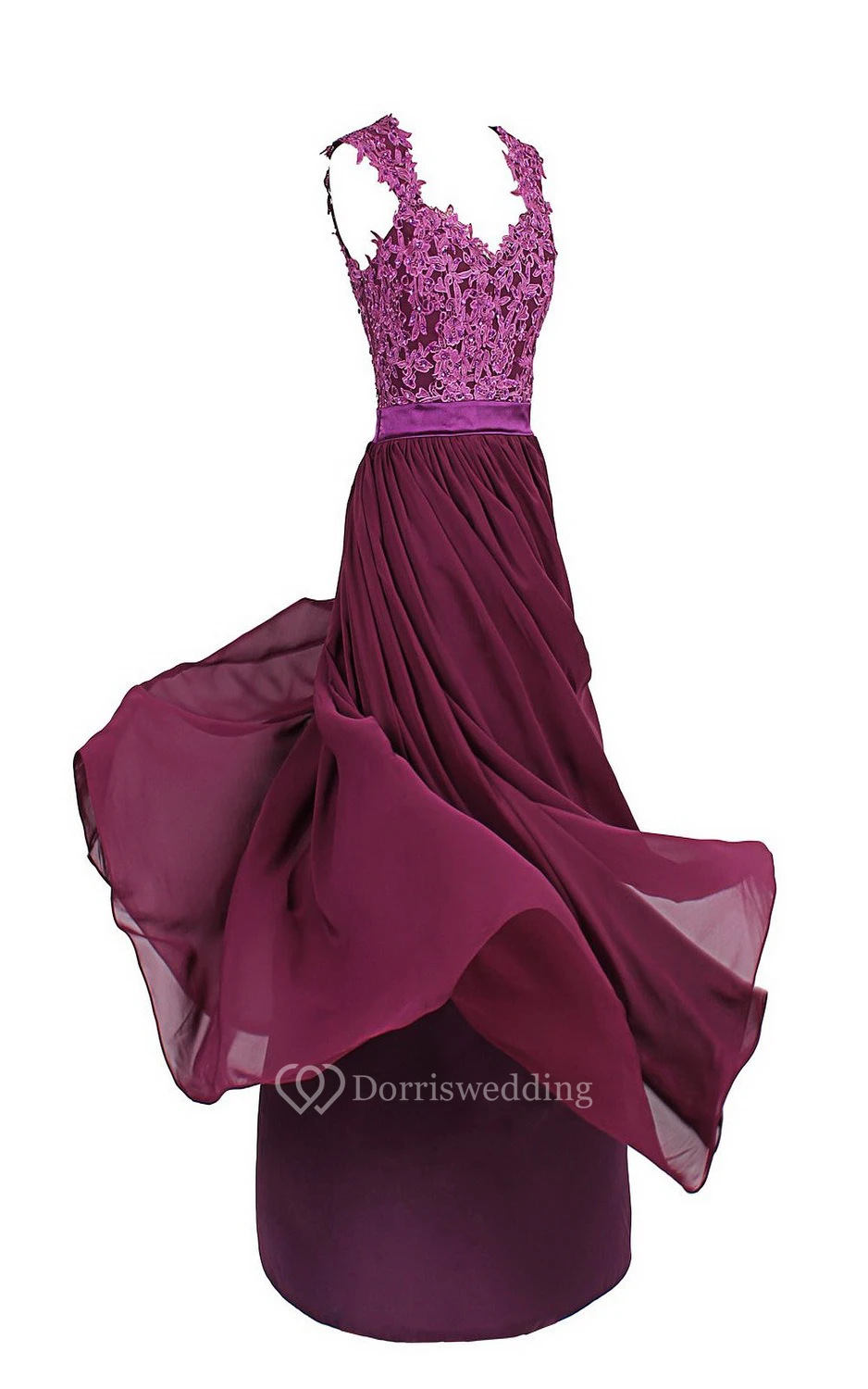 Sleeveless V-neck Lace Beaded Bodice Long Chiffon Dress