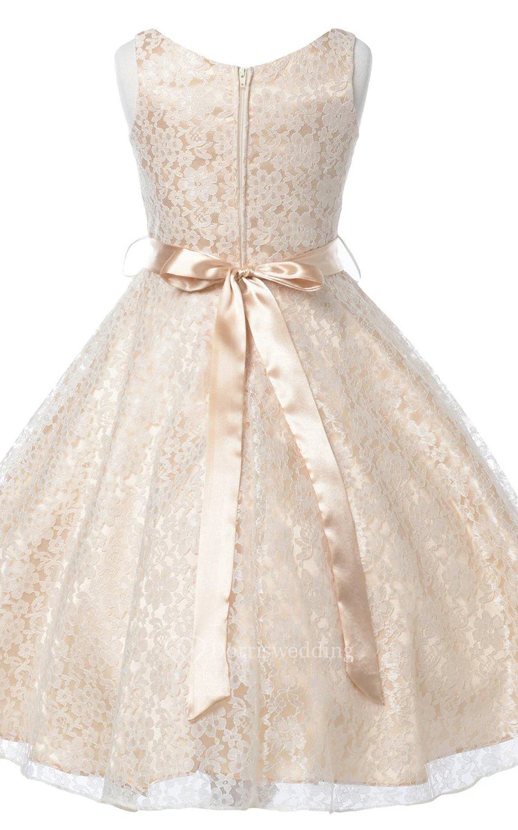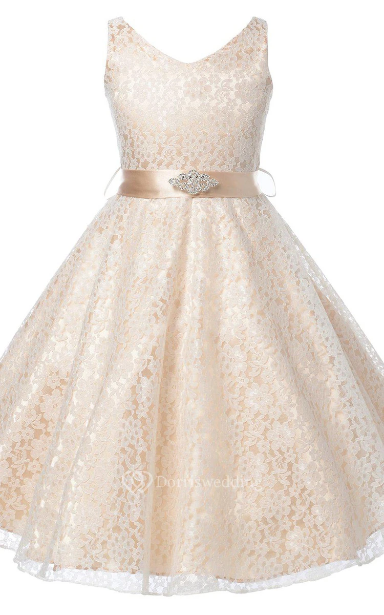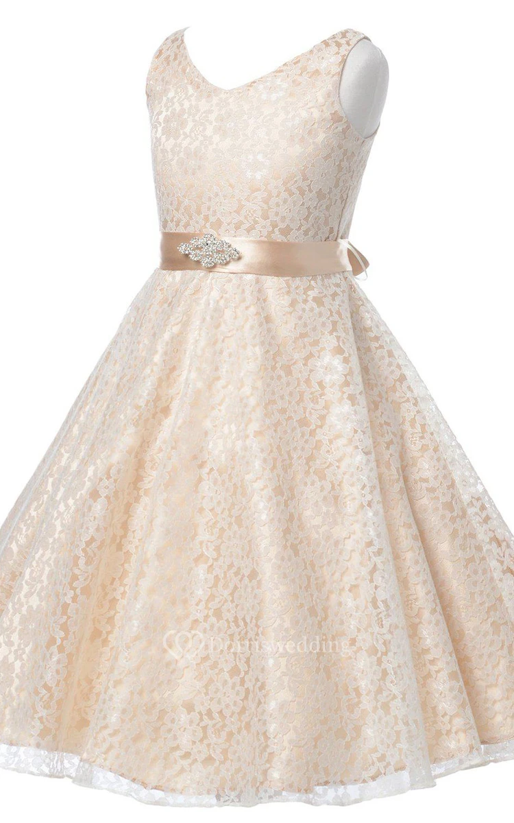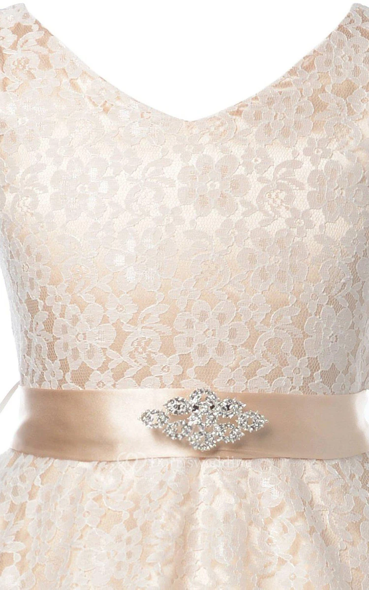 Sleeveless V-neck Lace Dress With Beadings and Bow